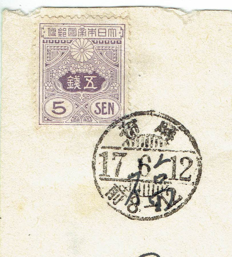 国内第1種便(封書20g)基本料金:5銭(昭和17年4月1日~19年3月31日)。
