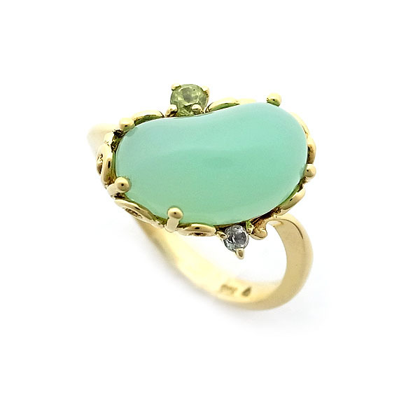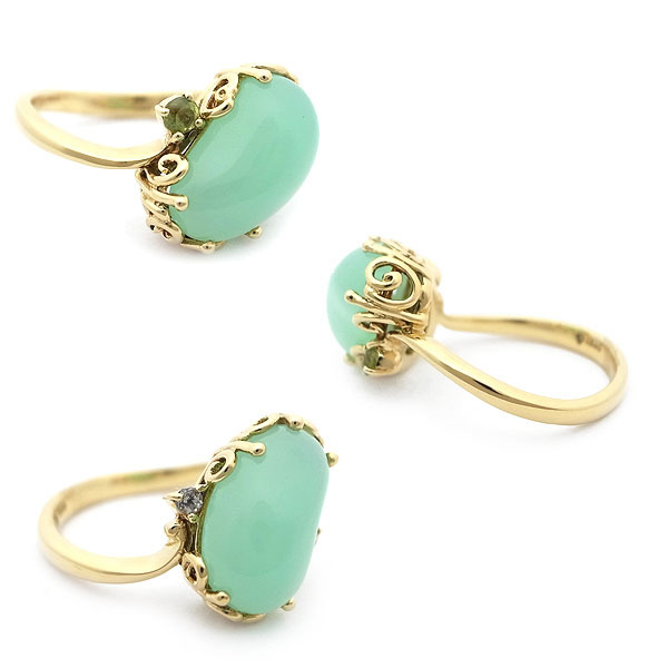 センターストーンはクリソプレーズかと思われ、ヒスイではありません。2石のサイドストーンのうち、1石はペリドットかと思われますが、もう1石は分かりませんでした。