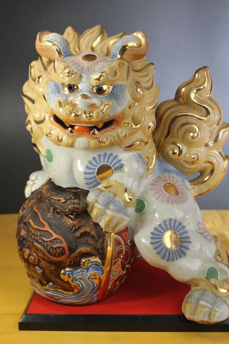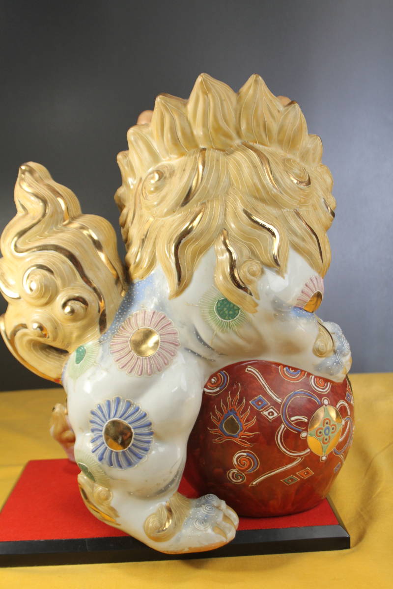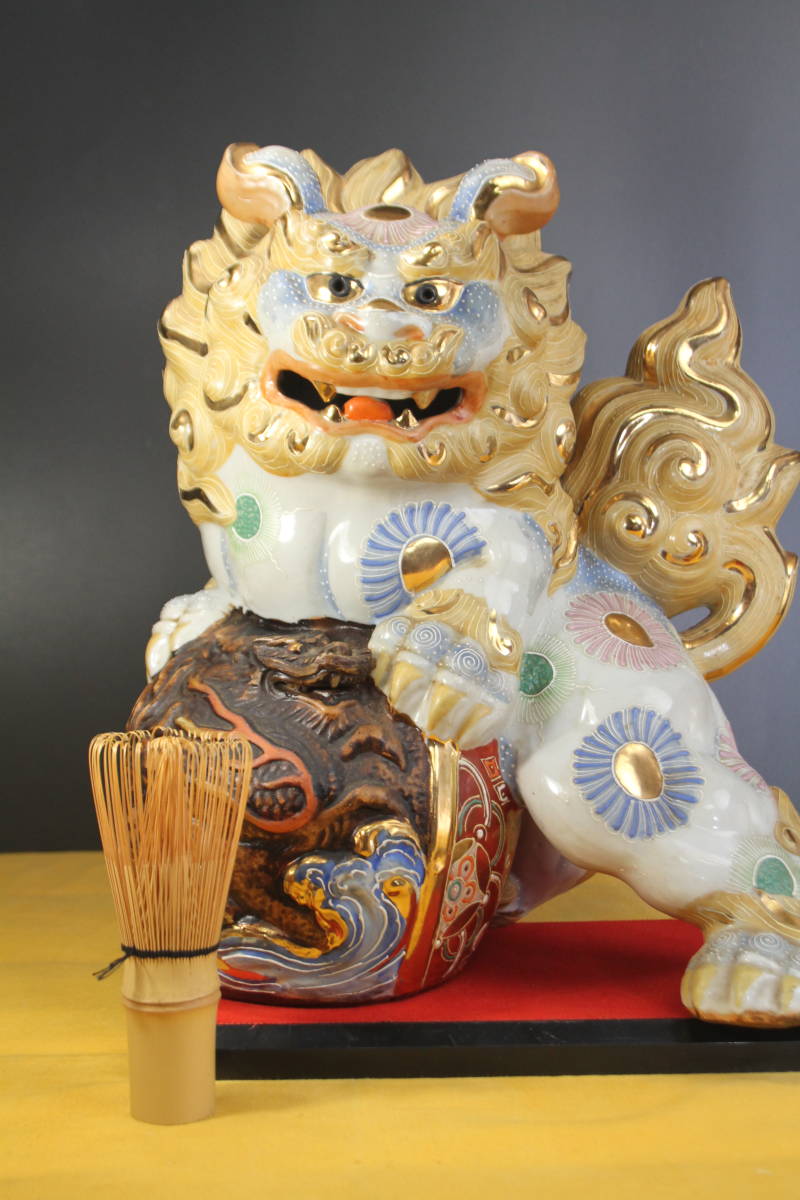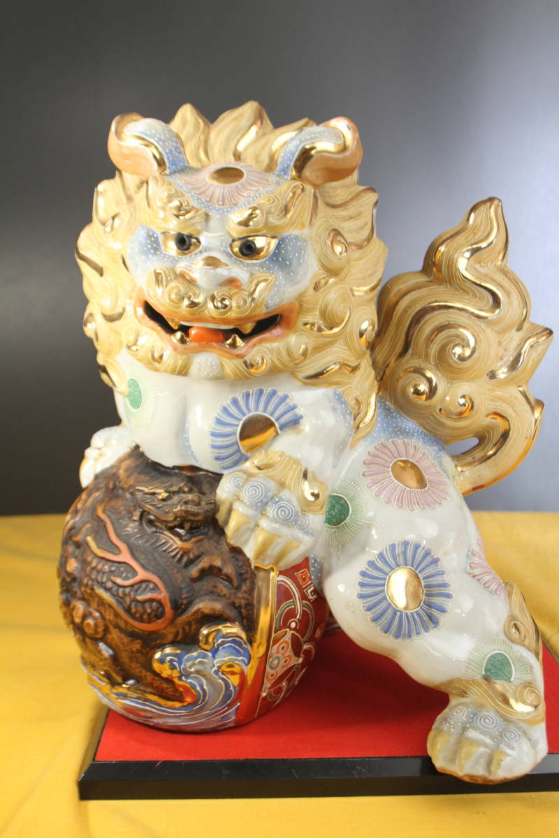 【信香】九谷焼★白獅子盛【白神金彩獅子盛 陶華作】玉盛かっ茶色 魔除け金運家内安全栄★高さ約31㎝幅25㎝ 奥行約21㎝ 美術品 美品