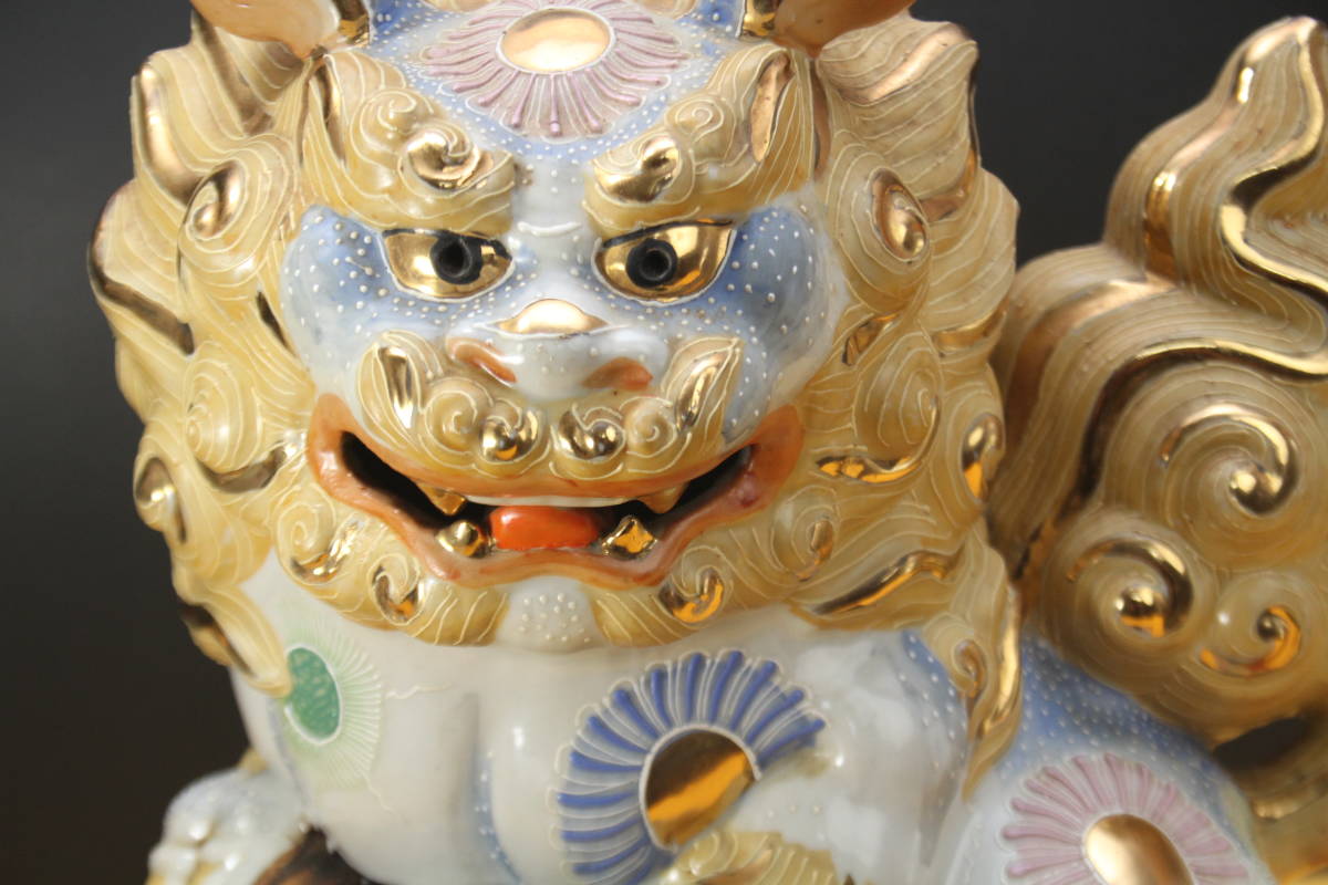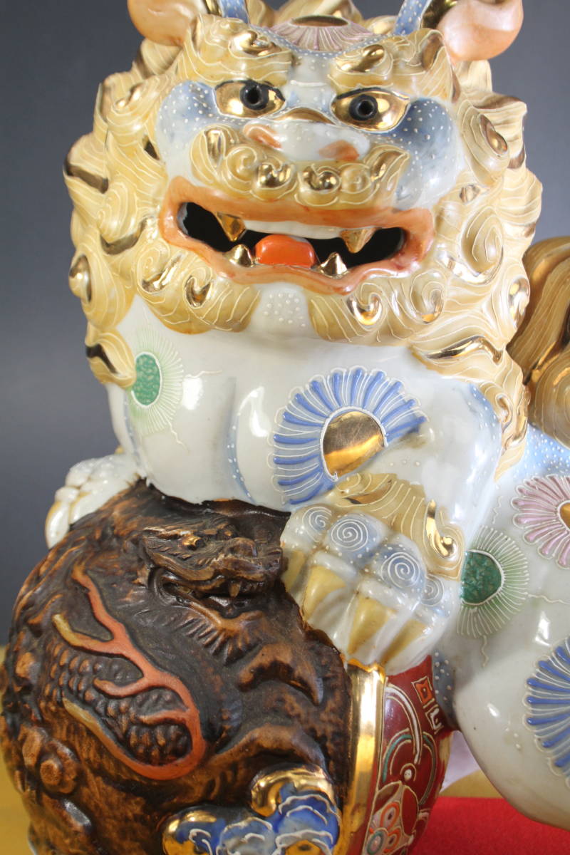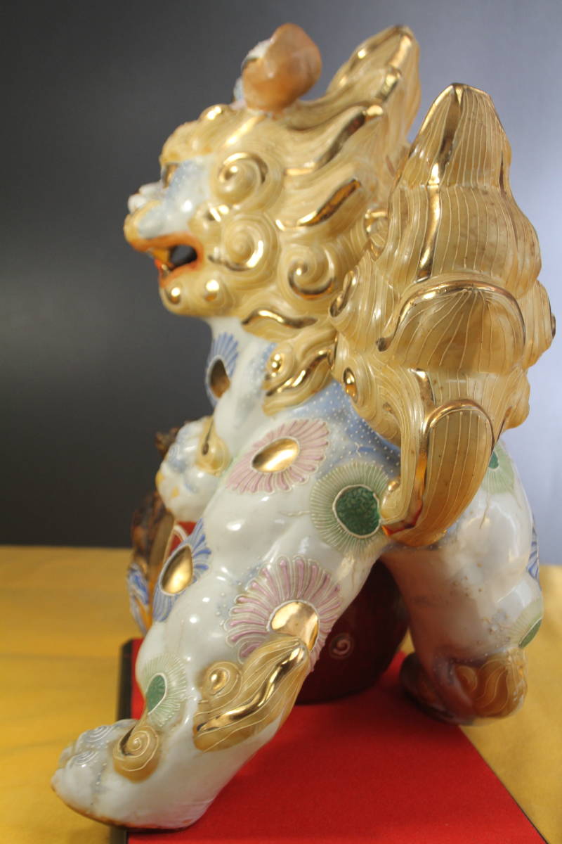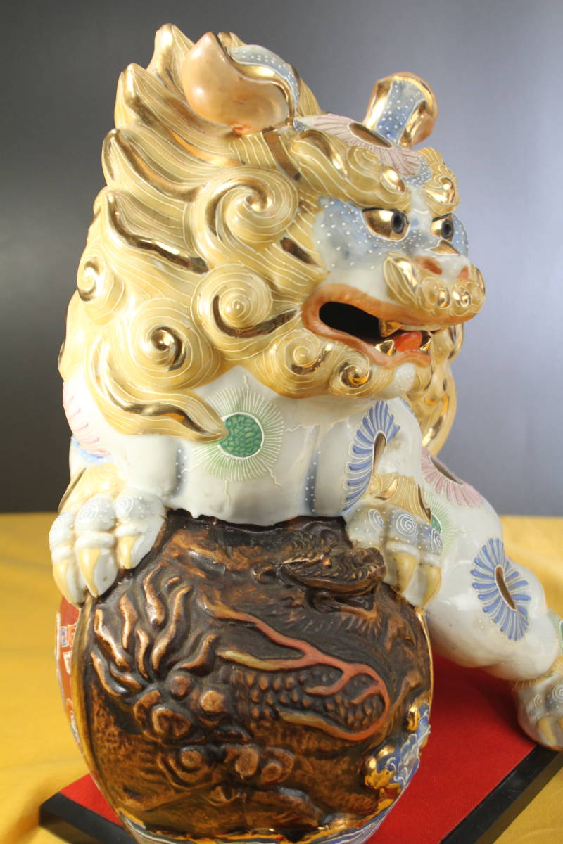 【信香】九谷焼★白獅子盛【白神金彩獅子盛 陶華作】玉盛かっ茶色 魔除け金運家内安全栄★高さ約31㎝幅25㎝ 奥行約21㎝ 美術品 美品