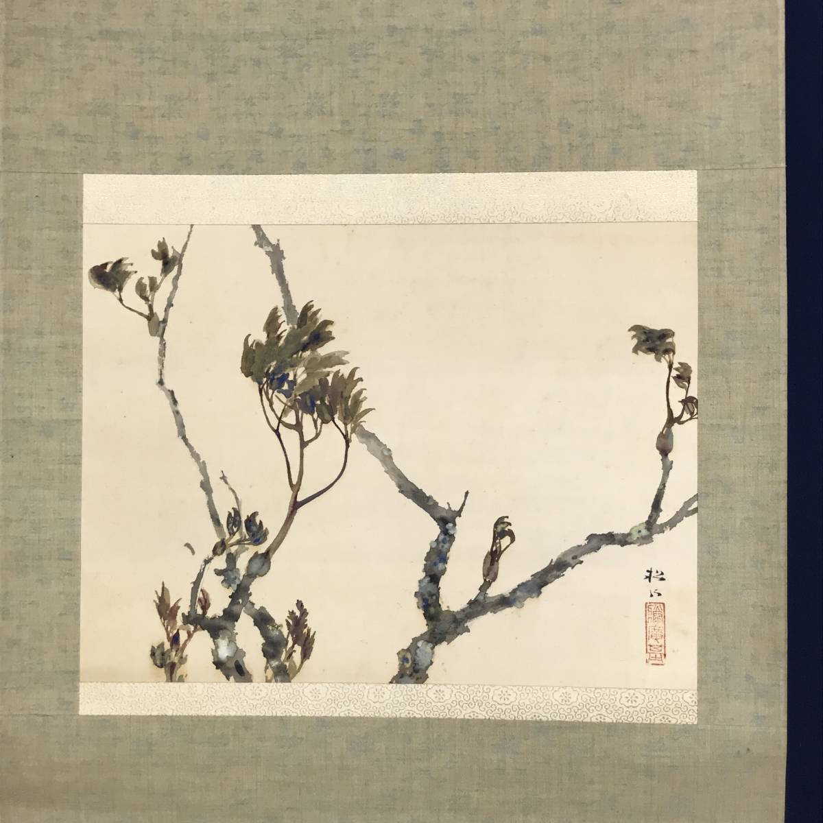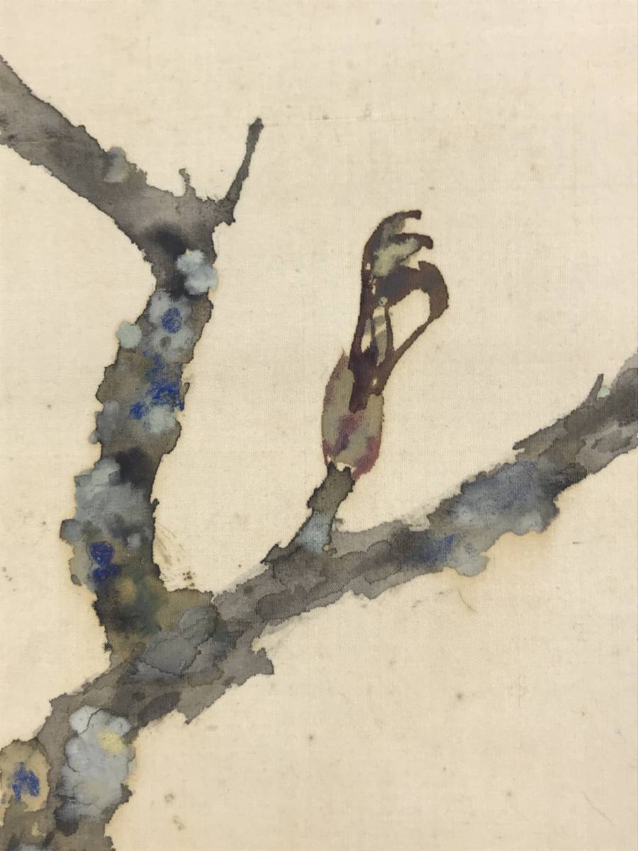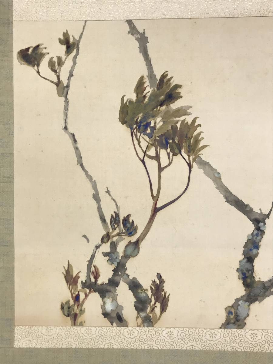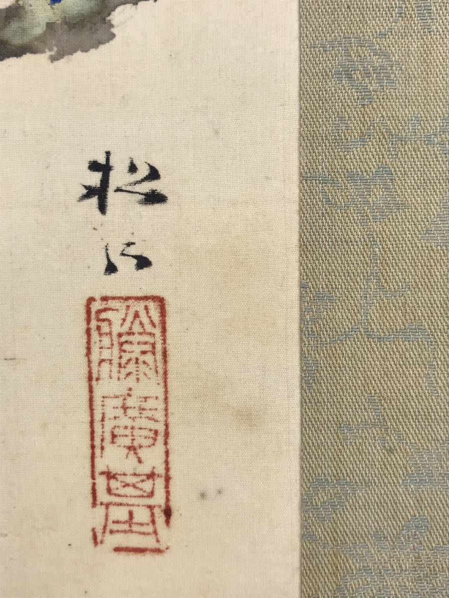 【作品状態】 本紙は絹本肉筆です。 本紙は薄汚れ、全体に糊シミあります。表装は薄汚れ、天地に多数の汚れシミあります。