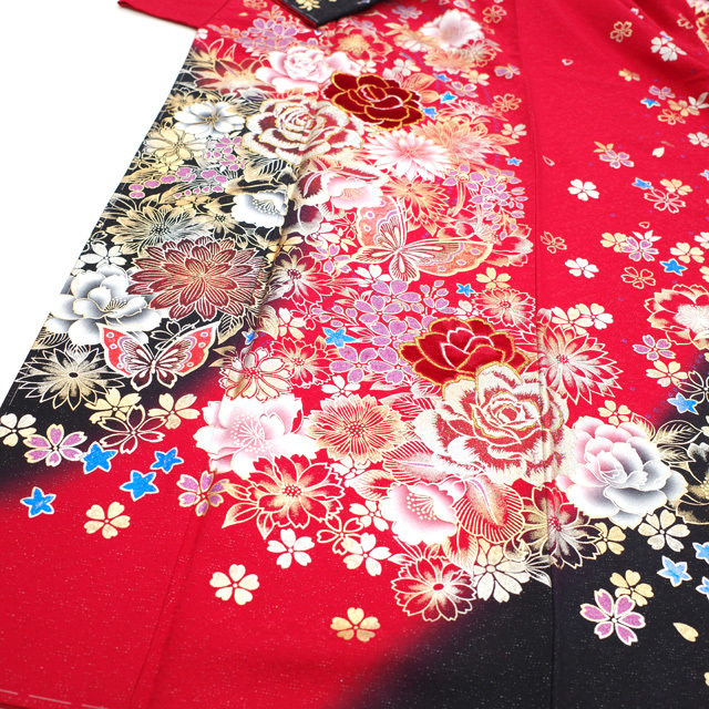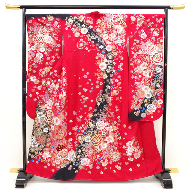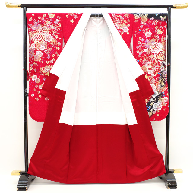 【中古】 振袖 着物 長襦袢 2点 セット 金彩加工 ラメ加工 銀通し 赤 黒 ぼかし バラ 薔薇 牡丹 蝶 桜 菊 正絹 豪華 成人式 二十歳 20歳 フォーマル 販売 購入 リサイクル 美品 中古 仕立て上がり 身丈167 裄68 Lサイズ みやがわ sb13211