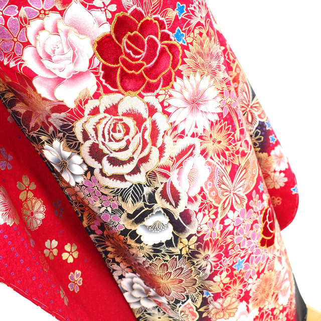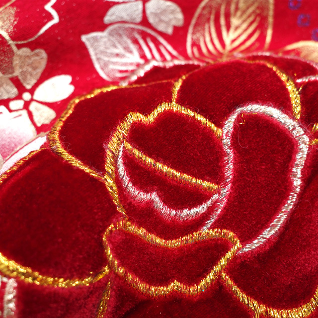 そこに、バラや牡丹・蝶・桜・菊などが染められています。