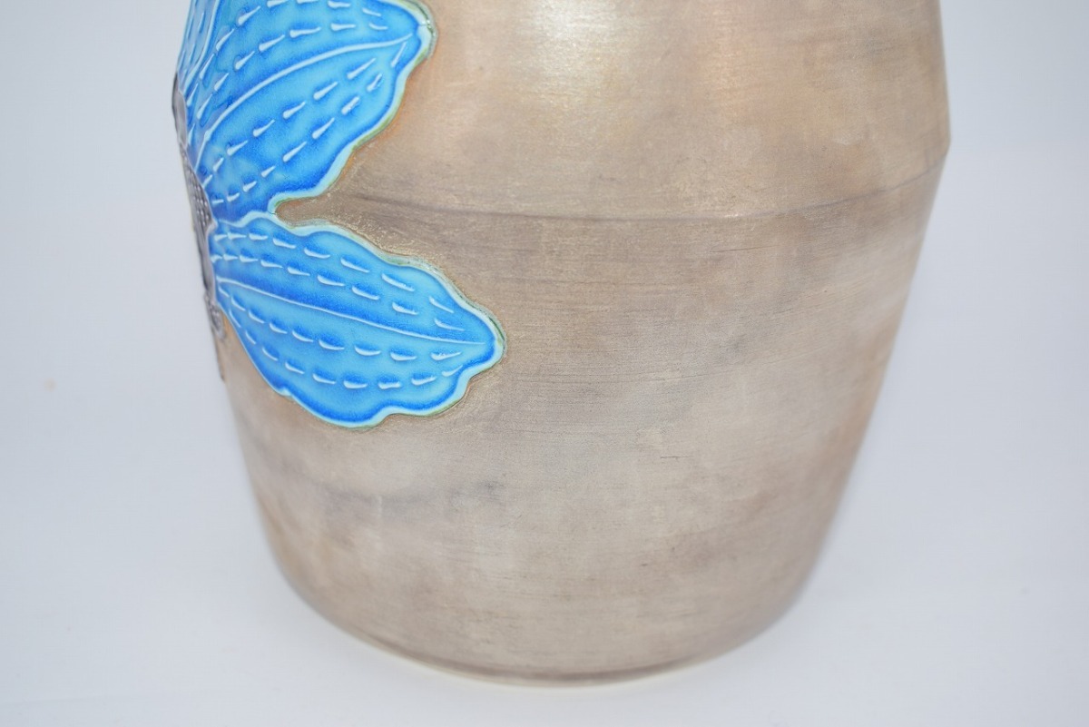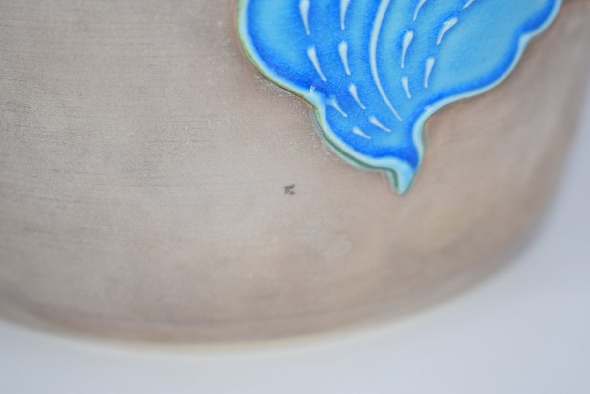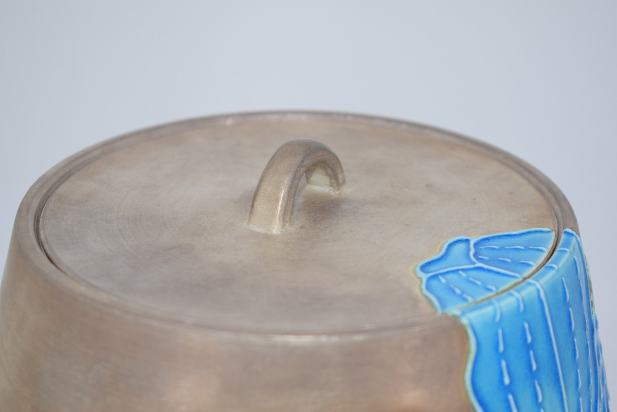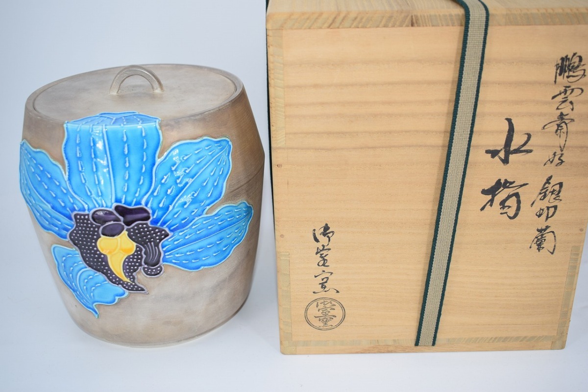 茶道具 鵬雲斎好 銀叩 蘭絵 水指 御室窯 作 径16.6cm 口径内寸12.2cm 高さ(摘まみ含む)18.2cm 銀焼け、木箱に汚れ、当りはありますが、本体はしっかりしています、お稽古にお使いになるには差し支えありません。注)水漏れは確認していません。