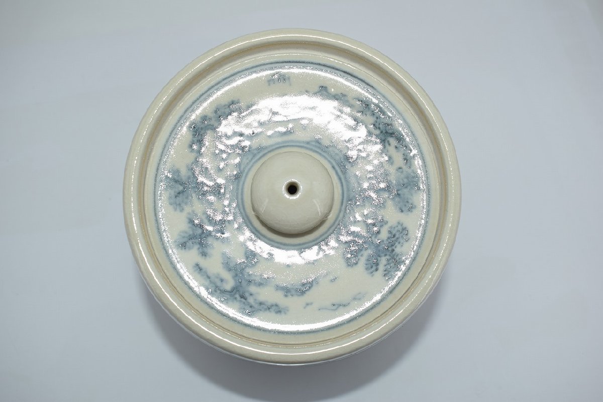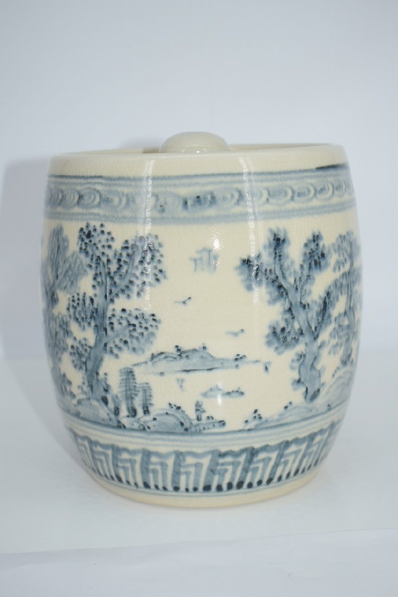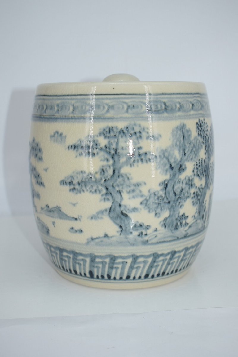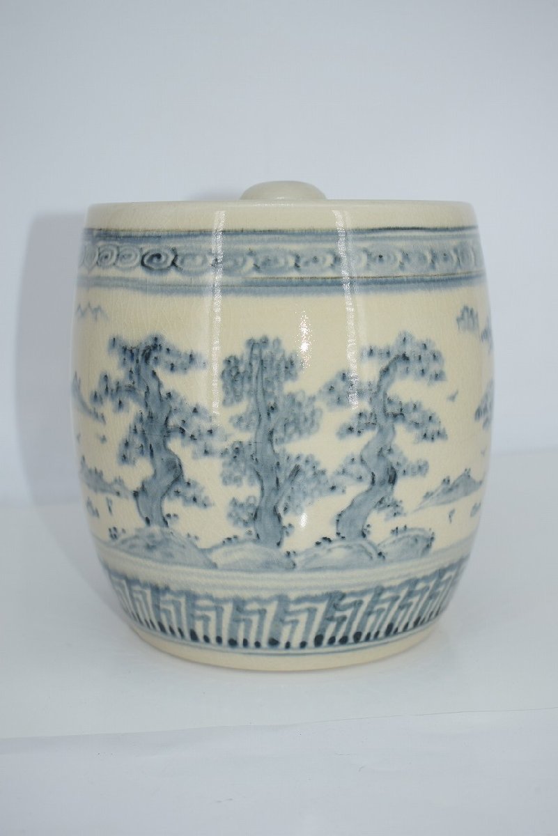 茶道具 御深井焼 山水松紋 水指 加藤 唐三郎 作 茶道 径16.3cm 口径内寸12.1cm 高さ(摘まみ含む)16.7cm 擦れ、汚れはありますが、本体はしっかりしています、お稽古にお使いになるには差し支えありません。注)水漏れは確認していません。
