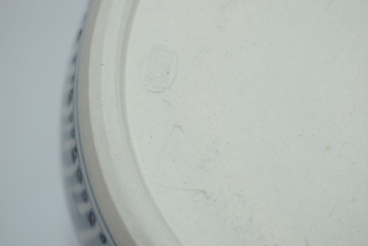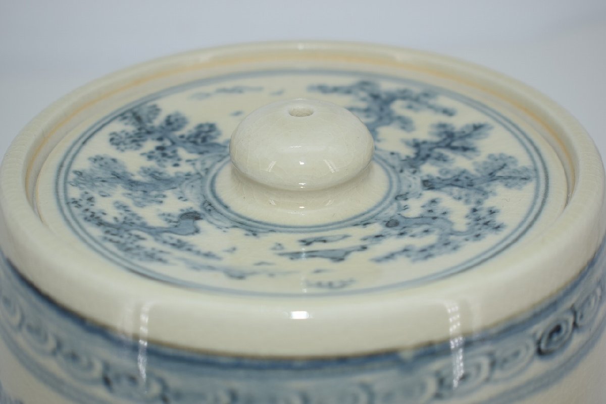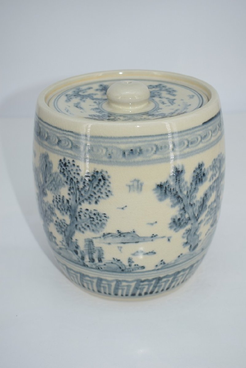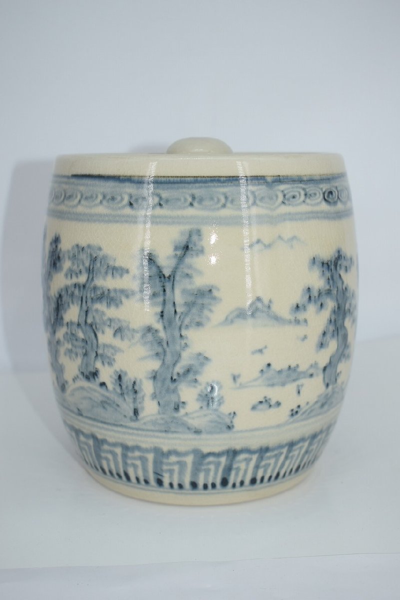 茶道具 御深井焼 山水松紋 水指 加藤 唐三郎 作 茶道 径16.3cm 口径内寸12.1cm 高さ(摘まみ含む)16.7cm 擦れ、汚れはありますが、本体はしっかりしています、お稽古にお使いになるには差し支えありません。注)水漏れは確認していません。