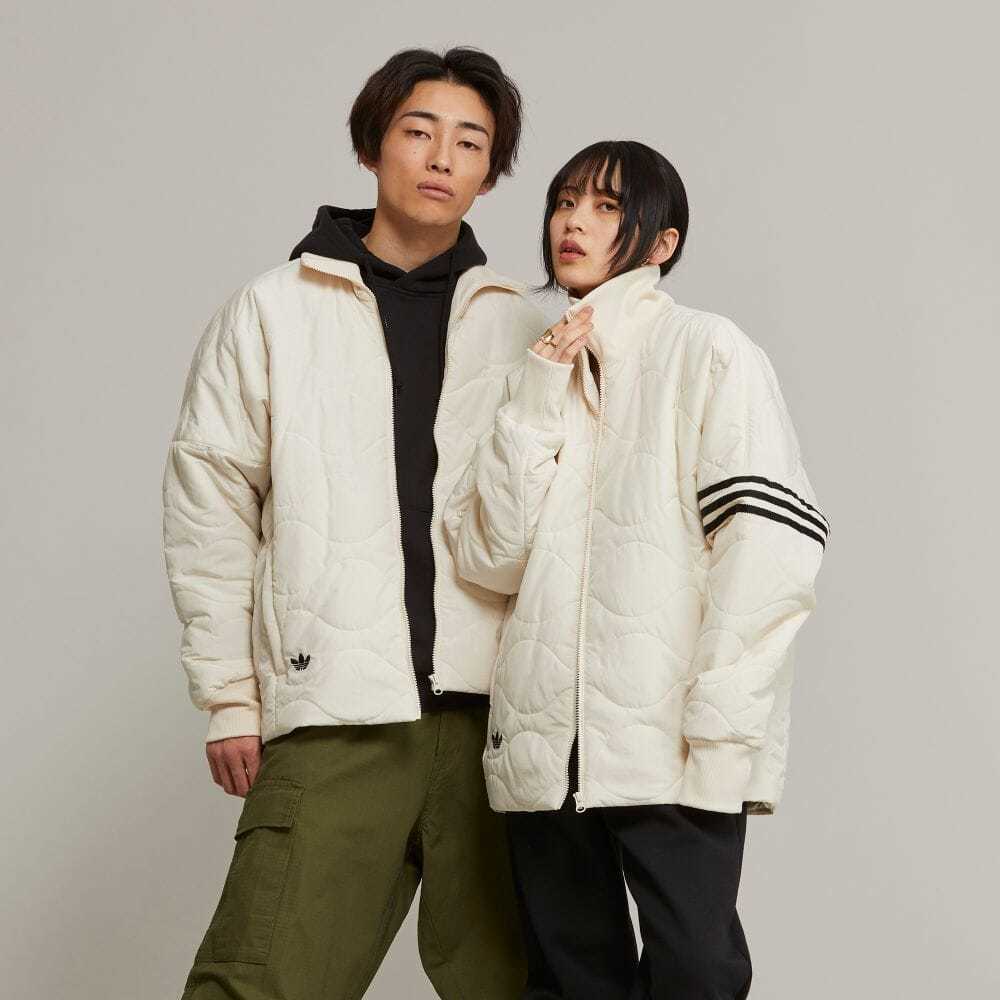 ・ハイネック、キルトパッドのデザイン、ギザギザのスリーストライプスでクリーンなアウトドアスタイルにまとめている。