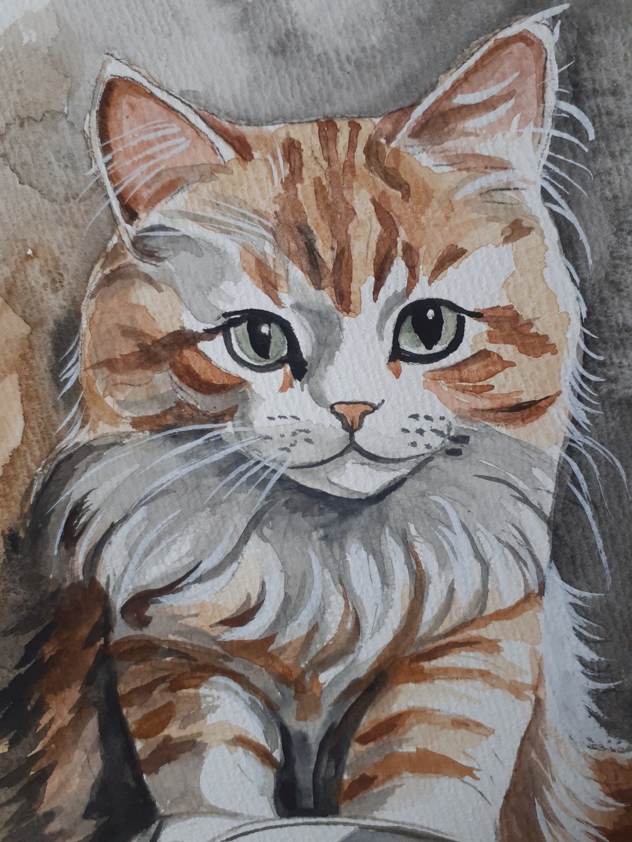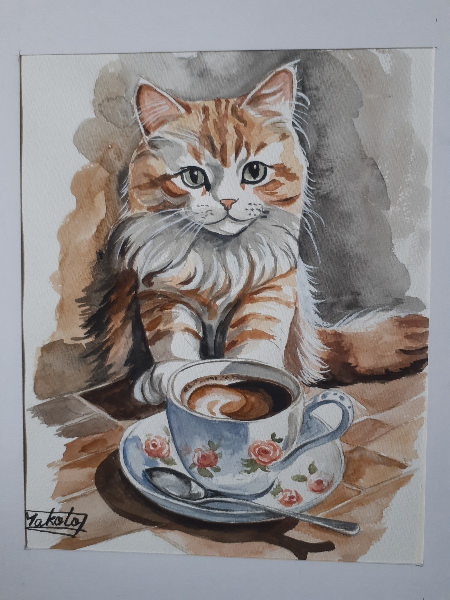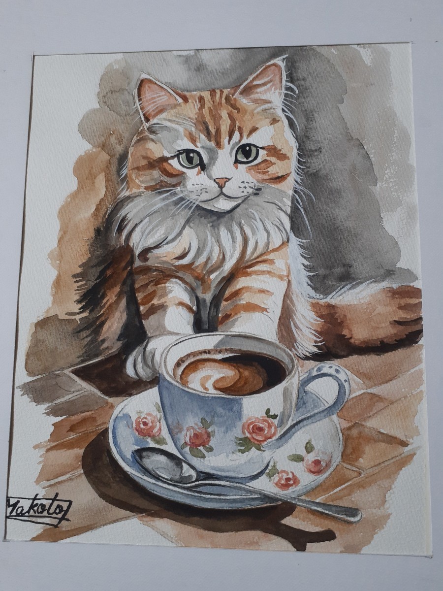 可愛いキュートな子猫のコーヒータイムを水彩画で描きました。