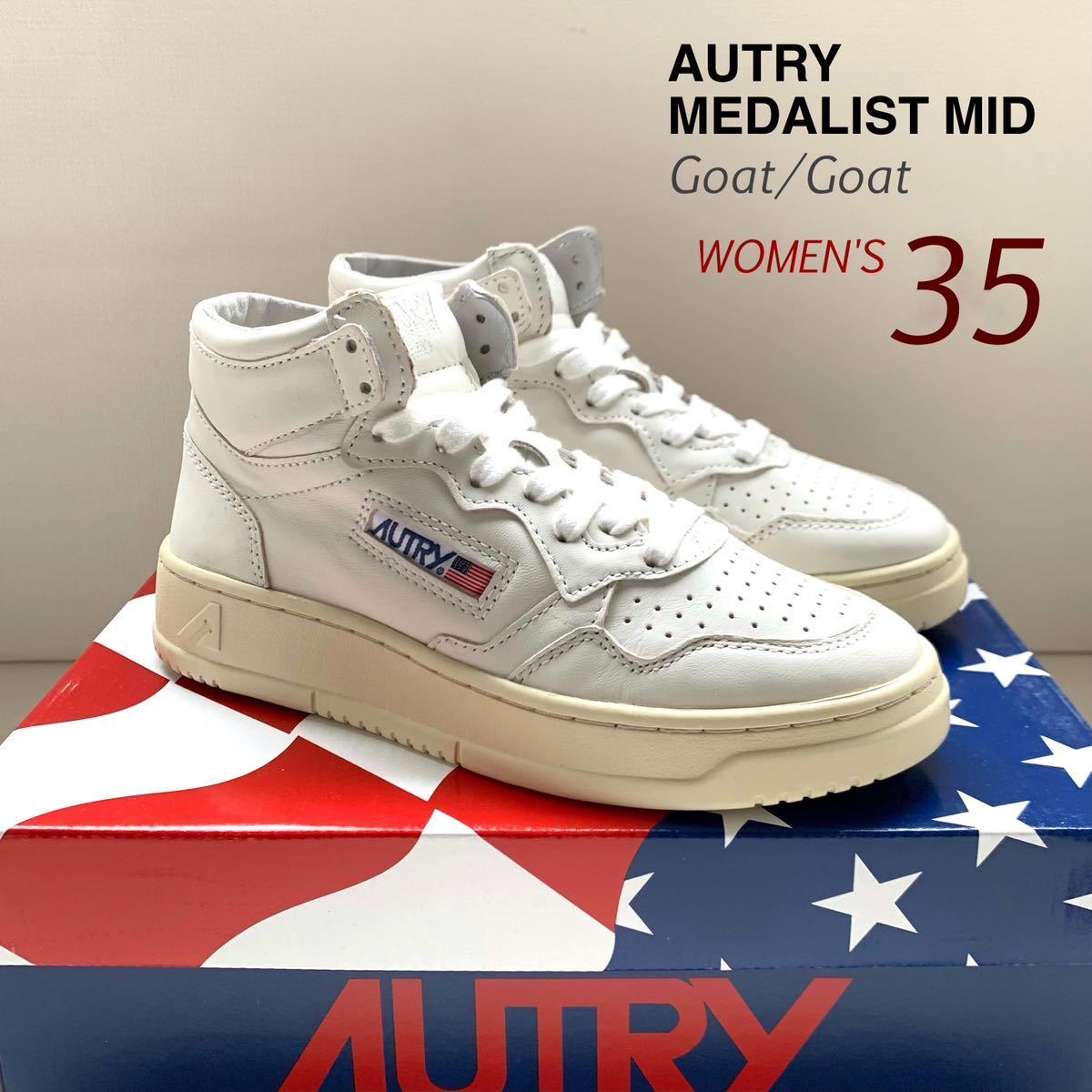 AUTRYのゴートスキンを使い単色のシンプルなデザインで仕上げらた「メダリスト」モデル、MEDALIST MID WOM です。80年代のヴィンテージスニーカーからインスピレーションを受けてデザインされたレザースニーカーです。独特のシワと柔らかさが魅力的な上質で柔らかなゴートスキンを使い丁寧に仕上げる事で、ラグジュアリーな履き心地を作り上げています。インソールには取り外しが可能な肉厚なEVAソールが使われ、フィット感と履き心地を高め、アウトソールにはフラットソールを採用し、グリップの良いオリジナルのソールパターンが描かれています。アウトソールはライトベージュがチョイスされ、程良いビンテージ感を演出しています。シューズの内側部分にはパイル素材を使用し、吸湿性の良さと肌当たりの良さを作り上げています。サイド部分には星条旗を湛えたロゴマークが配されデザインのアクセントとなっています。
