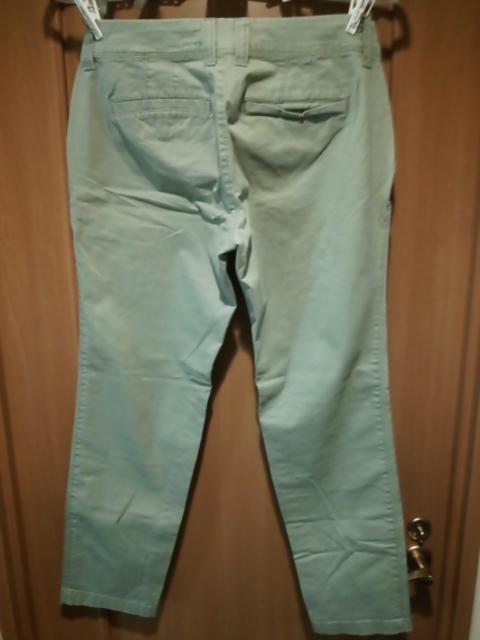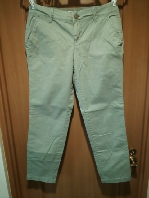 薄めカーキ、やや薄手の、ストレッチの効いた、さらりとしたコットン素材、ジップフライ、テーパードスタイル。