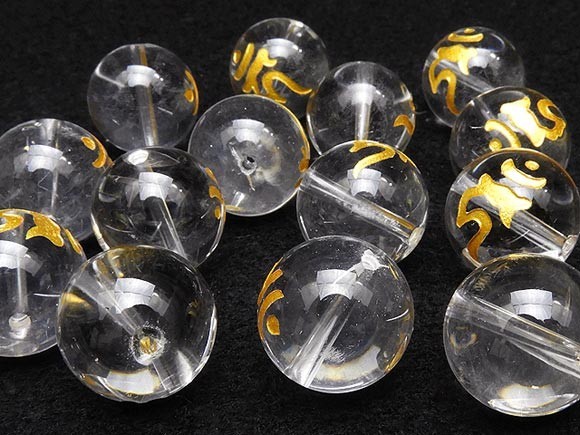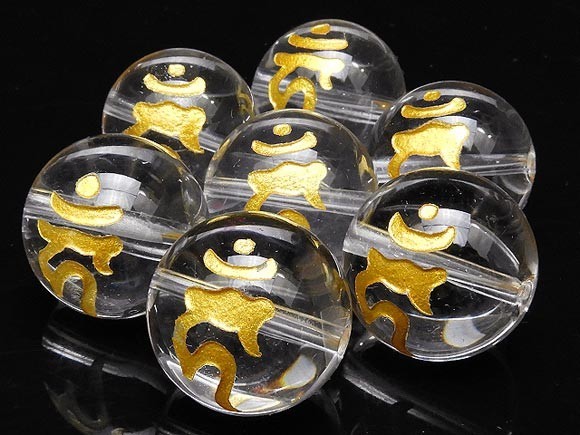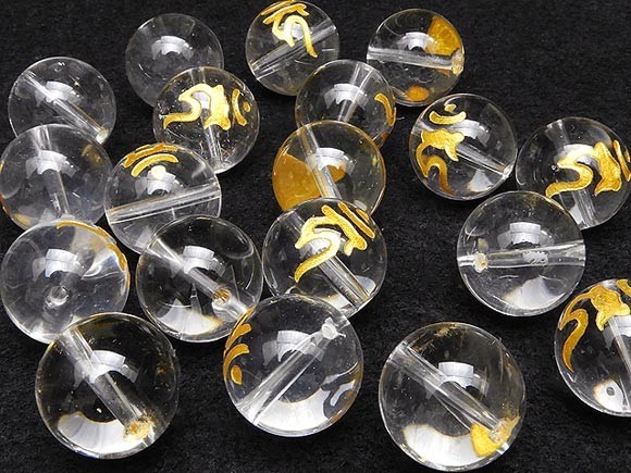 内包物のないクリアーで、とても美しく清浄な天然水晶クリスタルに梵字彫刻を施した後、金色のペイントを刻印した丸玉ビーズです。