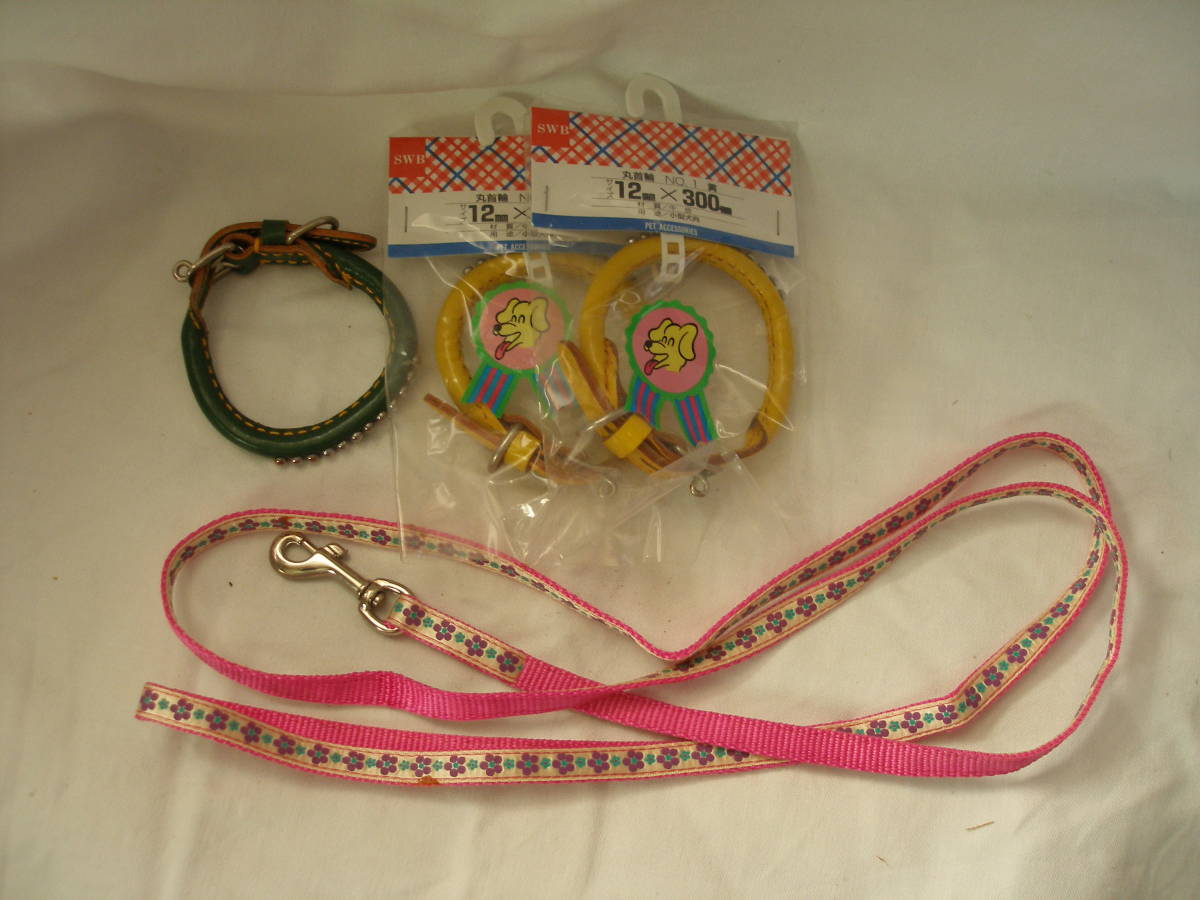 ペット 首輪 本革 3点 & リード 小型犬に ワンちゃん用 合計4点セット 未使用 倉庫保管品です。
