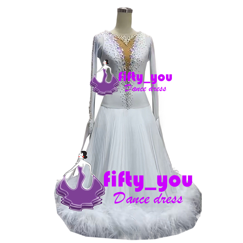新品fifty_you レディース社交ダンスドレス  魅力サイズセミオーダー 競技発表会ドレス お洒落パーティードレス 裾ファー飾り ホワイト