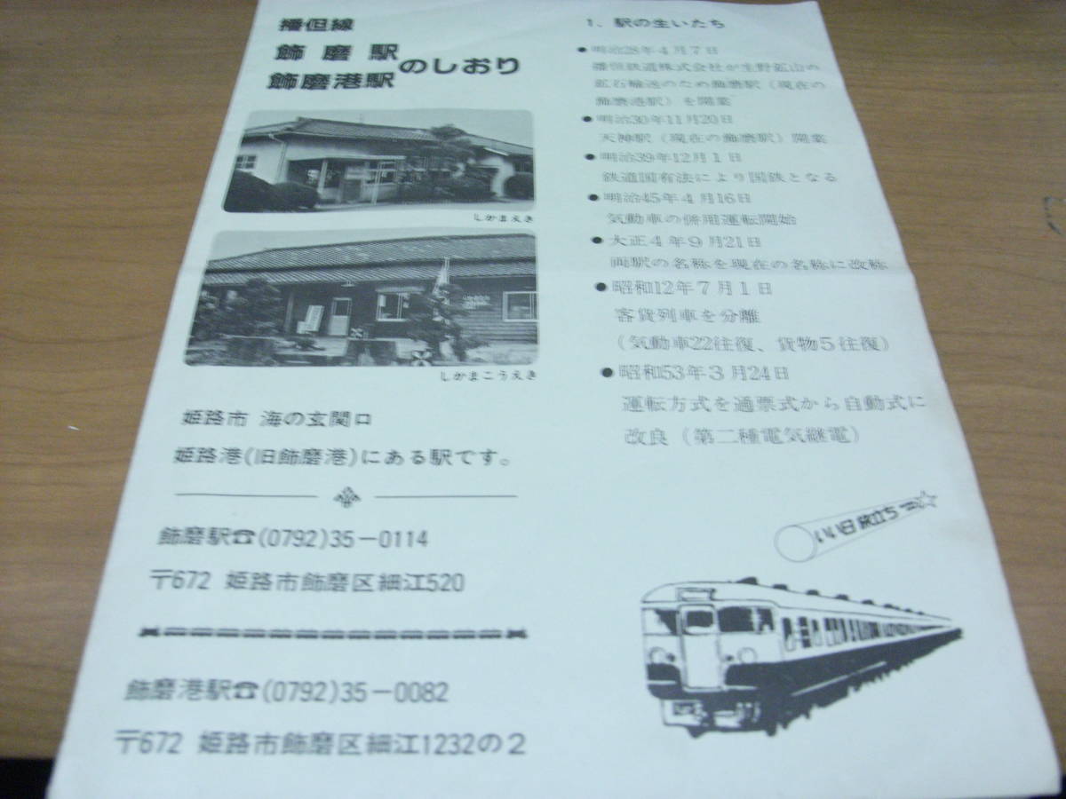 発行年不明・二つ折り両面印刷・広げた際のサイズ:B4サイズ・飾磨港駅、飾磨駅で発行されたしおりのようです。掲載内容 1.駅の生い立ち/飾磨の由来/飾磨の沿革/湛保/飾磨・飾磨港駅附近 略図/2.駅のあらまし/3.駅のしごと/ご案内