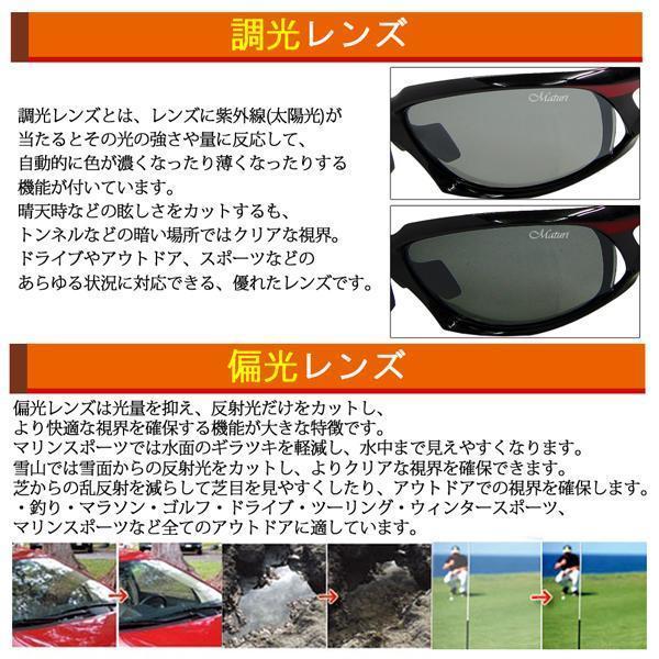 かっこいいデザインに、抜群のフィット感! 『調光偏光サングラス』 がついに登場! こだわりはとにかく『調光偏光レンズ』 紫外線の強さに反応し、レンズカラーの濃薄を自動的に調整する高機能が付いているので、 晴天時などの眩しさをカットするも、トンネルなどの暗い場所ではクリアな視界。 ドライブやアウトドア、スポーツなどのあらゆる状況に対応できる、優れたレンズです。 もちろん偏光機能も発揮。 反射光をより効果的にカットするので、ドライブ時のガラスへの映り込みや、 フィッシングやスキーなどの水面・雪面のギラギラした光を遮り、快適な視界を確保します。 ・ノーズパッドはすべりを防止するラバー素材 ・大きめレンズで視界広々 ・軽量で疲れを知らず、抜群のフィット感 ここまで進化したサングラスを是非体験して下さい。 当店が自信を持っておすすめします! ■カラー:レンズカラー/ライトグレー、フレームカラー/ブラック×レッド ■サイズ(約):レンズ横6.5cm×縦4cm、フレーム幅(内側)13.5cm、テンプル11.8cm ■可視光線透過率:9%~15% ■紫外線透過率:1%以下 ■付属:専用ケース ■生産国:Taiwan ■新品・未使用 調光レンズは紫外線の量と気温により反応の仕方が異なります。 すべての調光レンズは『温度依存性』と『紫外線依存性』という2つの性質が関係してます。 ■温度依存性質■ 温度が低い時ほど、色変わりが高く、色が濃い状態を持続します。 レンズ表面の温度が上がると色が変化している状態が弱まり機能調整が弱まります。 ■紫外線依存性質■ 調光レンズは紫外線の量に『多い時⇒色が濃くなる』『少ない時⇒色が薄くなる』傾向がございます。 上記の理由により気温が低く紫外線量が多い5月等のほうが夏場30度以上の状況よりも反応が強く現れます。 また全ての調光レンズにはおおよそ2年程で調光機能が低下していくことがございます。 ※Maturiの商品は日本でデザインされた日本のブランドです。 ※ご覧のモニターやプラウザの設定、照明等により、画像と実物の色合いが若干異なる場合がございます。 ※製造上の過程により、商品によっては細かな傷がある場合がございますが、傷についてはノークレーム・ノーリターンでお願いします。 | |
