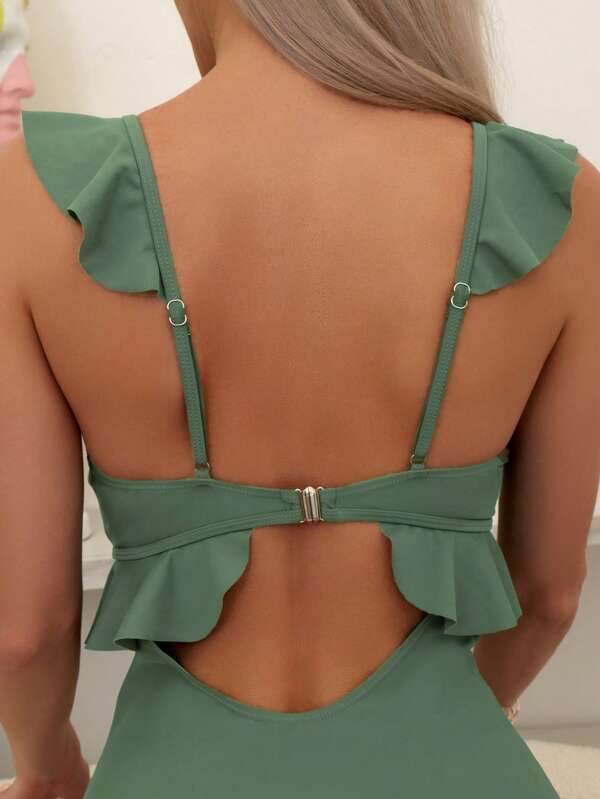 レディース 水着 ワンピース フリルトリム カットアウト 前結び ワンピース水着