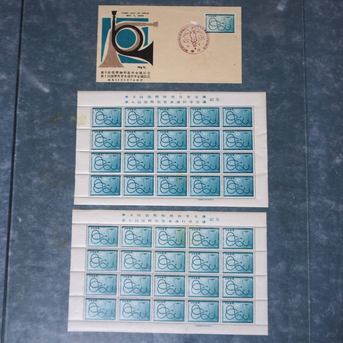 状態良好 !! 1958.9.7. 発行「国際胸部医学・気管食道科学会議記念 ( 聴診器 )」の20枚シート切手×2枚・ 「初日カード」×1枚 セット品