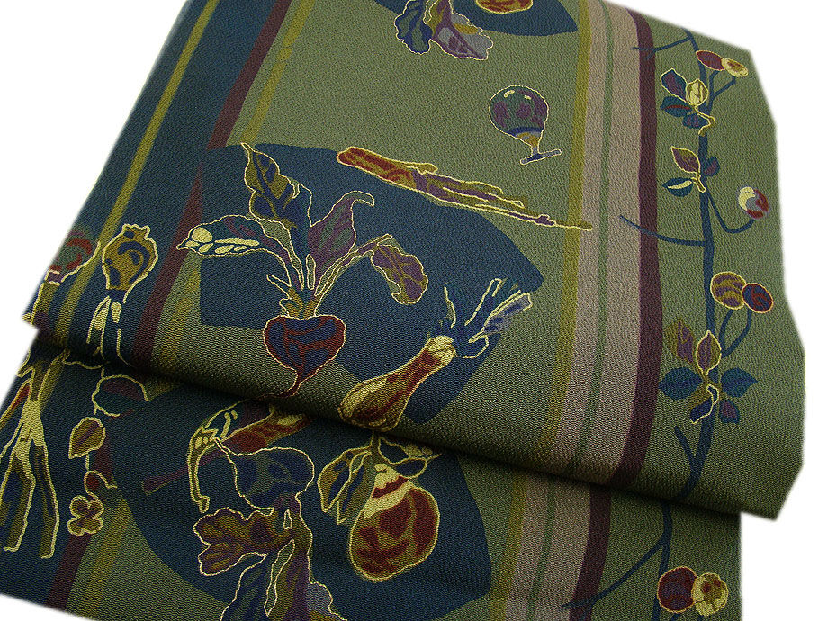 | 商品説明 | しなやかな扱い易く結び易い縮緬地のなごや帯。 渋い麹塵色地に濃紺色、エンジ色、紫色、金茶色等の野菜柄。 全通柄。 |