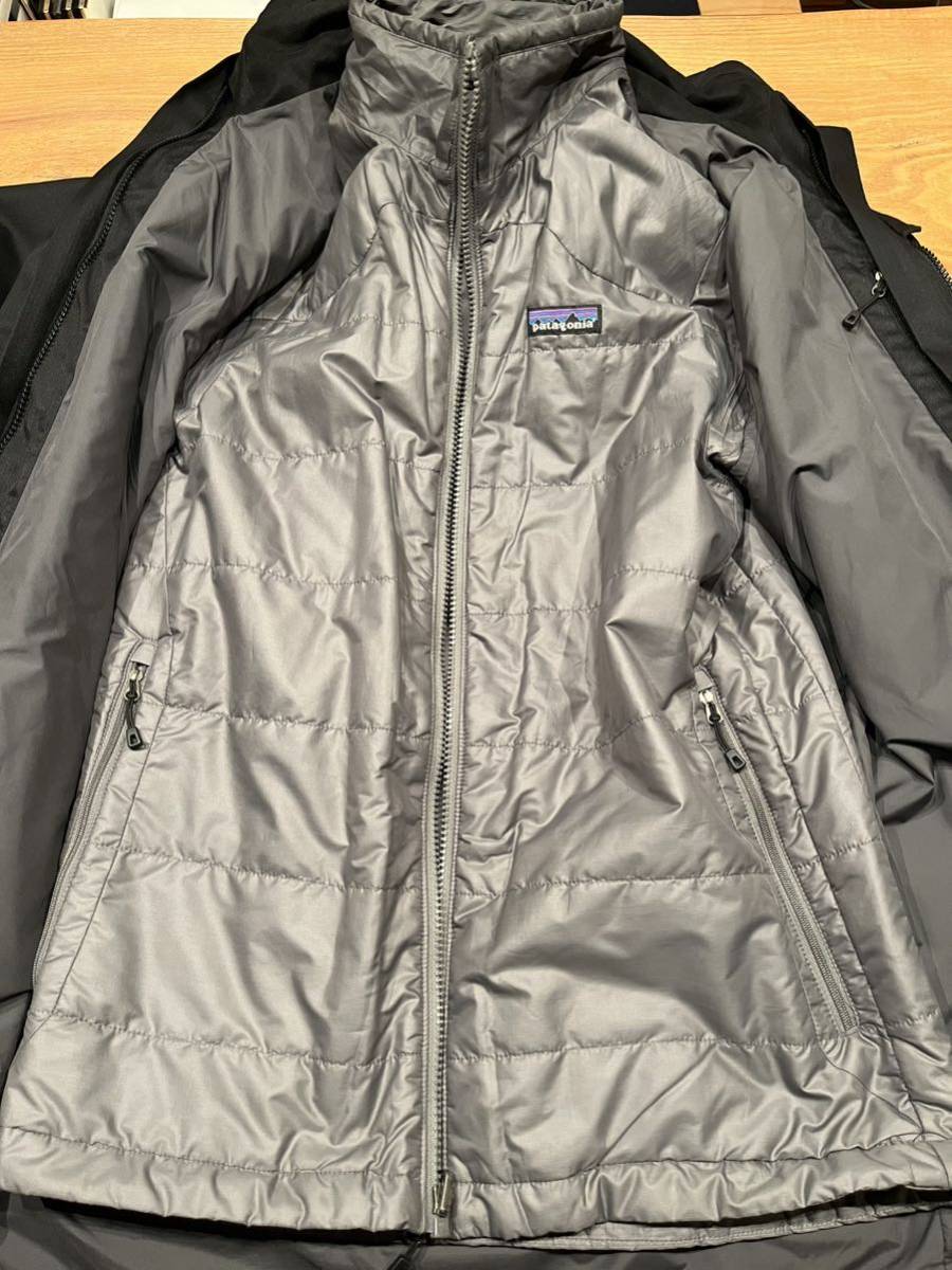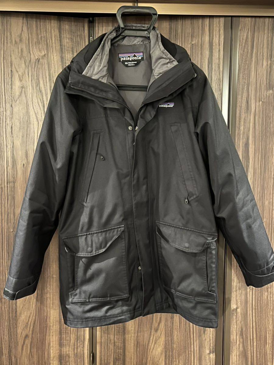 patagonia パタゴニア スリーインワンジャケットです。カラーはブラック、メンズXSサイズです。実寸は着丈79cm、身幅53cm、肩幅42cm、袖丈63cmとなります。写真10枚目の通り右脇下に補修跡があります。あくまで中古品となりますのでノークレーム・ノーリーターンでお願いします。宅急便の着払いでの発送を想定しています。