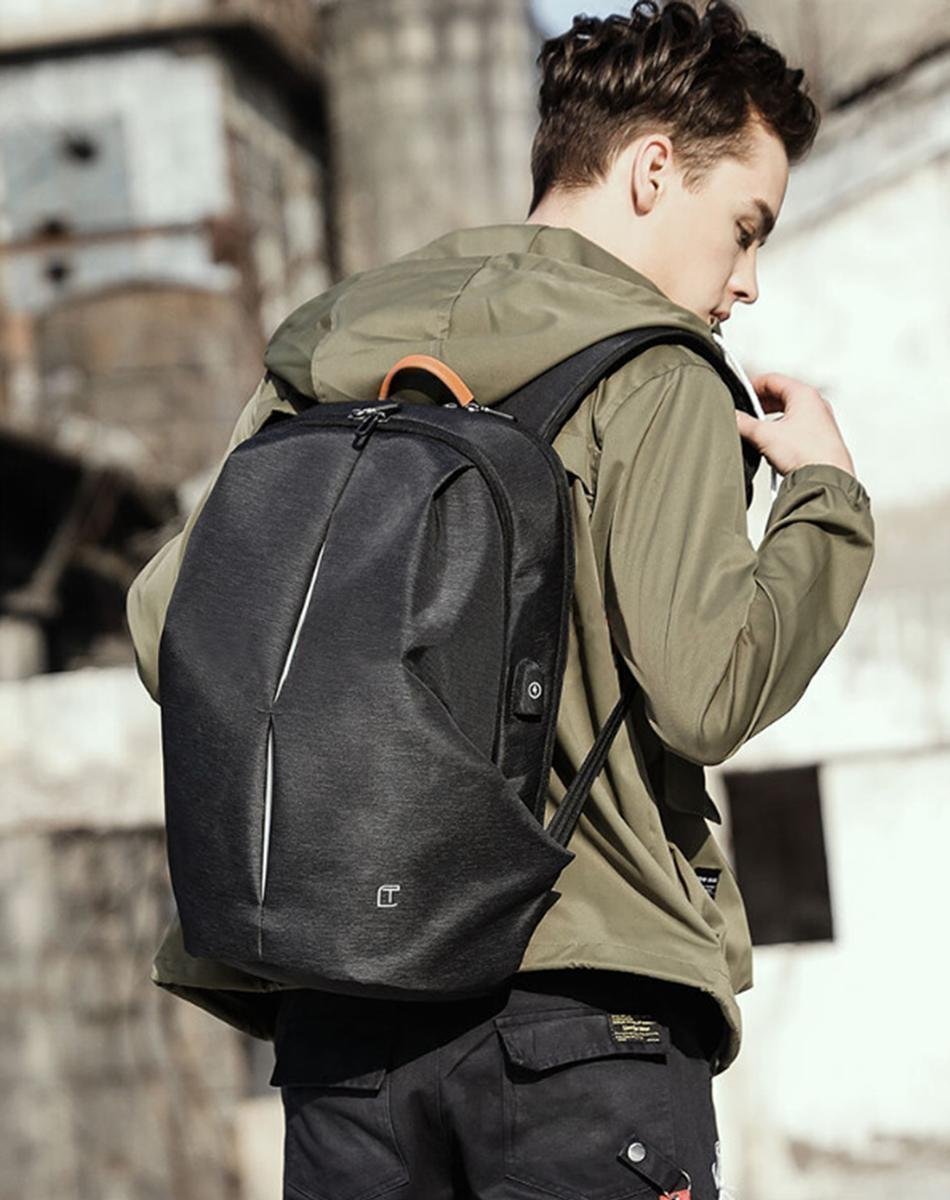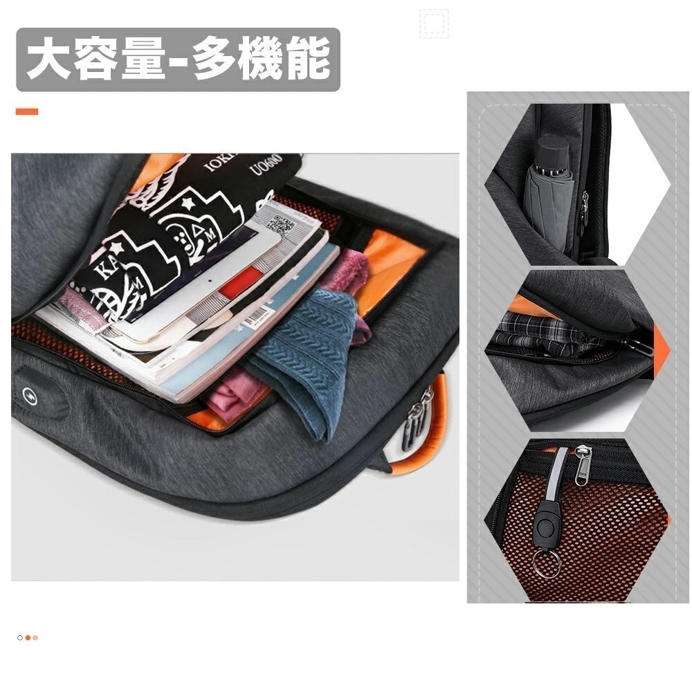「リュックサック 多機能」1.側面にUSBポートあり、内面にケーブル付き、自分のモバイルバッテリに連続できる。2.両サイドのに折り畳み傘やドリンクボトルの出し入れの便利さのためのゴムひも付きポケットを設置。