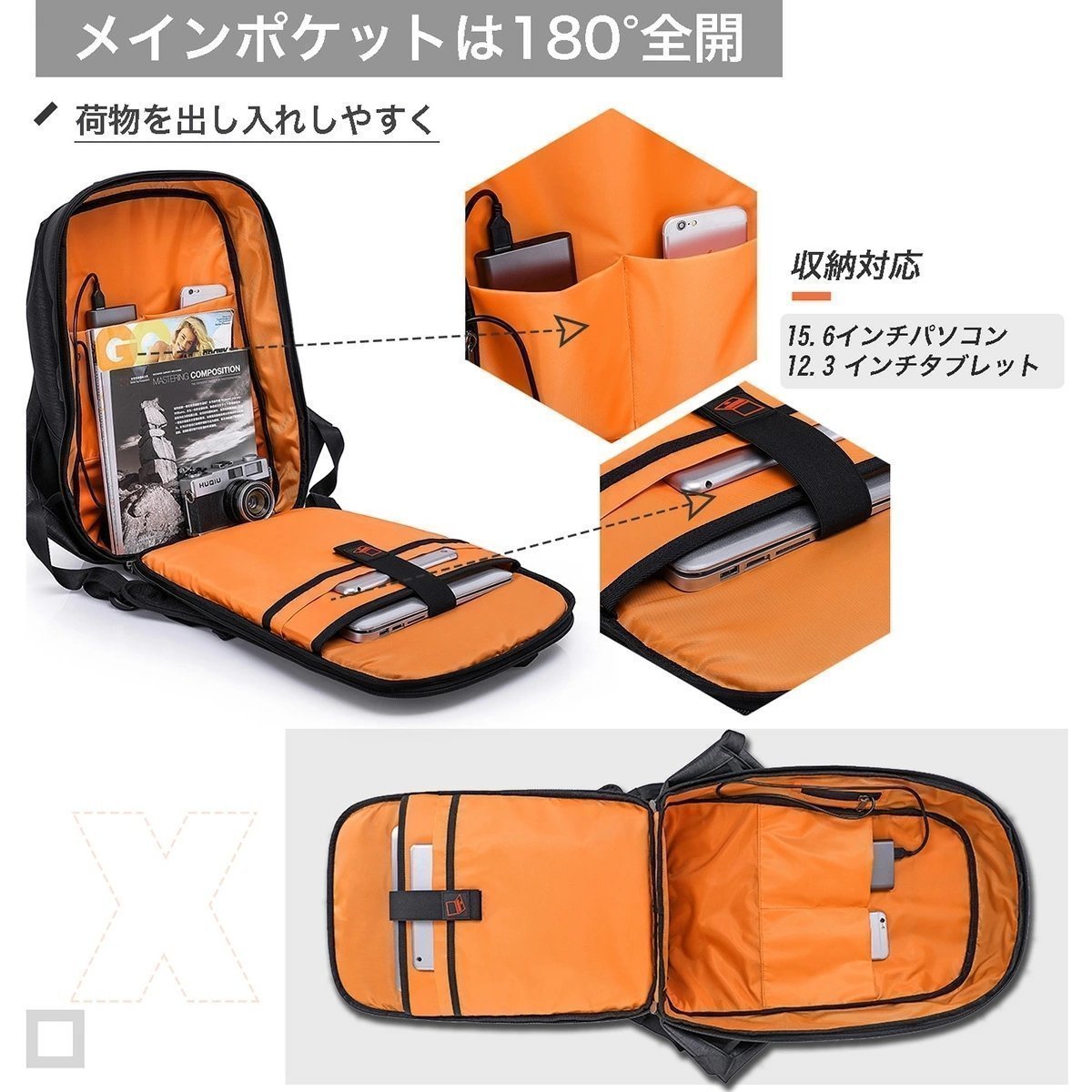 「ラップトップ バックパック」1.メインポケットは180°広がり、荷物が一目瞭然で把握できる。内側は機能別の収納ポケットが各種ついていて、ノートpcとipad用の二層衝撃吸収クッションポケット、モバイルバッテリーやスマホ用のポケット等、整理整頓簡単。2.中にもすっぽり入るくらい深いので2泊分の着替えやA4サイズの書類、弁当などいろいろなものが入る。