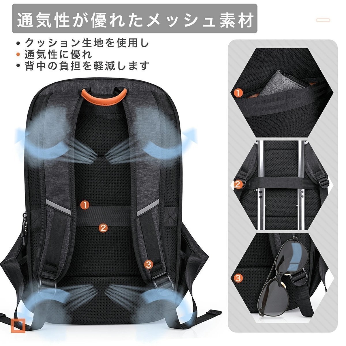 「リュック ビジネス 防水」1.表面は肌触り良く、丈夫な防水高密度ナイロン生地を使用し、雨の日に出勤しても安心。2.背面と肩ベルトはクッション生地を使用し、通気性が良いので暑い日でも全然蒸れない、背中の負担を軽減できる。長時間背負っていても肩が痛くない。3.軽くて丈夫、大容量だから通勤、通学、旅行、ビジネスに最適。