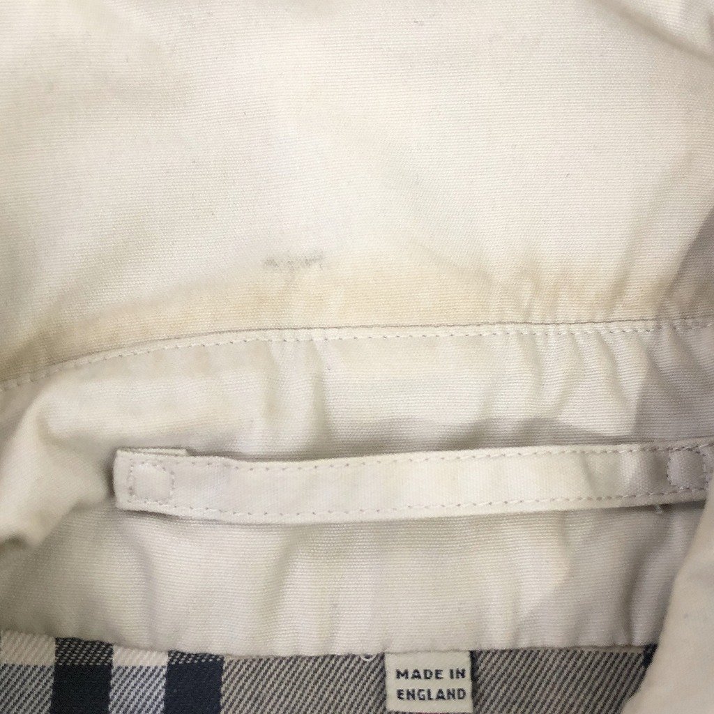 | [商品管理番号] P1826 [ブランド] BURBERRY/バーバリー [表記サイズ] -- 表記無し(≒ M相当 ) [実寸サイズ] 肩幅:約38cm 着丈:約99cm 身幅:約50cm 袖丈:約599cm [素材] [色] ベージュ [仕様] 生産国 : イングランド製 ヨーロッパ古着 トレンチ [状態] 汚れ:襟、首元、袖、袖先、胸、腹部、背中 | |||