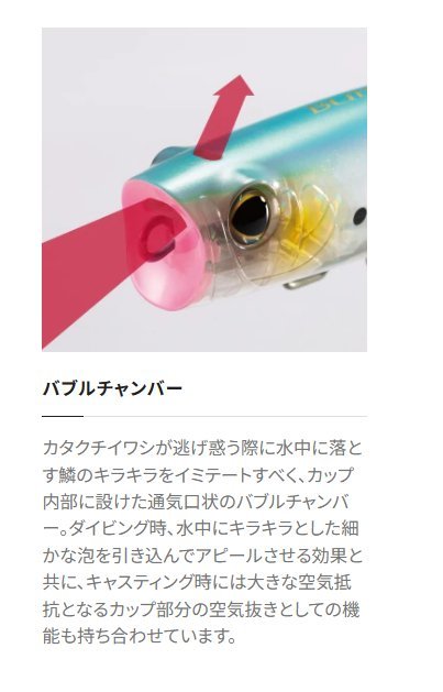 通常のペンシルベイトよりもスプラッシュが出しやすい小型カップは、