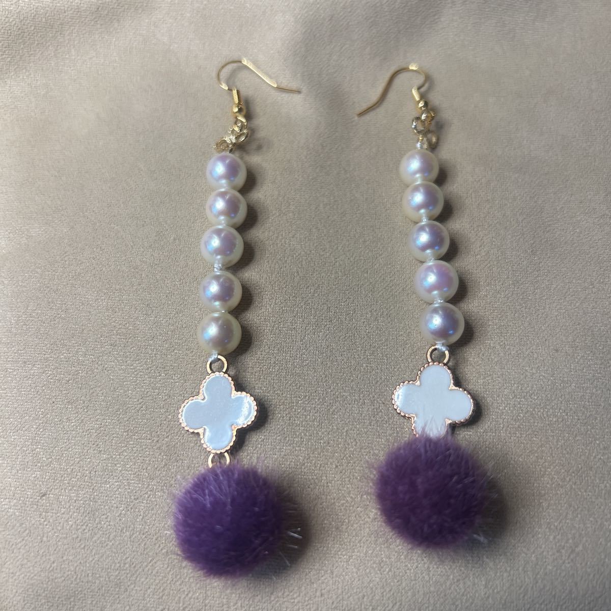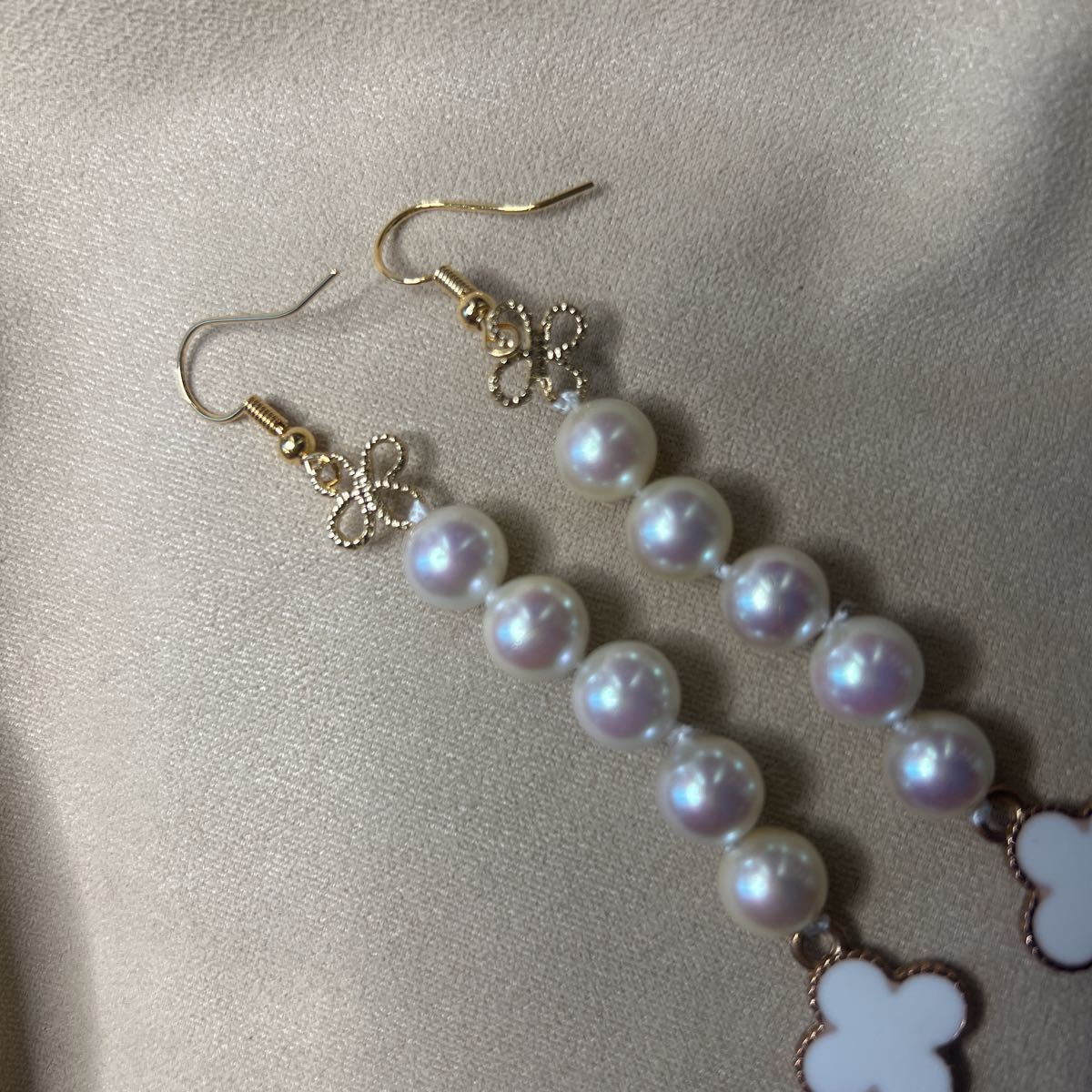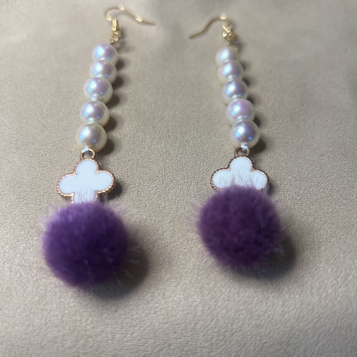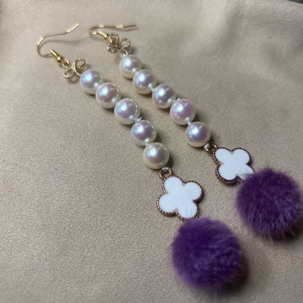 上質の貝パールにファーボールをつけました。とても可愛いです。貝パールは糸で繋いでるので結び目等目立つ箇所あります、画像でもわかる通り貝パールは天然ならではのへこみキズ等ございます。貝パール(シェルパール)非常に光沢のあるお品になります。天然の淡水真珠の真珠層を削り出し、その粉をきれいに貝の核の表面に、コーティングしたものです。輝きは、天然の真珠層によるものですので非常に綺麗で、お買い得です。フックステンレス使用しております。