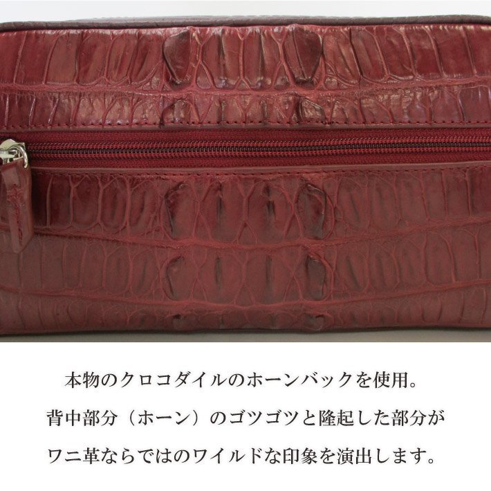 | 高級感あるクロコのホーンバックのセカンドバッグ 本物のクロコダイルのホーンバックを使用しています。 背中部分(ホーン)のゴツゴツと隆起した部分がワニ革ならではのワイルドな印象を演出します。 マット加工を施しており、落ち着いた上品さも兼ね備えています。 メインの収納はファスナー付きで2層に分かれており、収納するものを分類できるので整理がしやすいです。 バッグ自体はコンパクトなのに、割と大きめの小物もスッキリ収まります。 両面両側のファスナー付きフリーポケットはよく使うカード等を入れるのに便利です。 誕生日プレゼント・クリスマス・バレンタイン・父の日・母の日などの贈り物にも最適です。 ワシントン条約゛CITES(サイテス)“の規定に基づいて輸入された養殖のエキゾチックレザーを使用しています。 (CITES(サイテス)は本物の証明として発行されるものです) ※ご注意※ ・天然素材のため1点1点模様が異なります。柄でのお取替えはできませんので予めご了承の上ご購入くださいませ。 ・製造過程や入荷時期のより色合いなどに若干の誤差が生じる場合がございます。 ・商品の仕様、デザインは製品向上の為に予告なしに変更になる場合がございます。 ・ご覧のモニターやブラウザの設定、照明などにより、画像と実物の色合いが若干異なる場合がございます。 以上ご理解とご了承の上、ご購入をお願いいたします。 ■カラー:WINE ■素材:クロコダイル ■サイズ(約):横26cm×縦14cm×マチ10.5cm ■重量:約380g ■仕様:外側(メインファスナーポケット×2、ファスナーポケット×2)内側(ファスナーポケット×1) --革製品について-- ・製作過程により多少の傷、汚れ、縫い目が粗い、塗装にムラ、接着剤跡等がある場合がございます。 ・天然素材の商品は、自然由来の素材のため革には細かなシワや傷跡・トラ等が存在する場合があります。 ※シワなどは、動物の生育環境や年齢、個体によって異なる、革の特性です。 ・ご覧のモニターやプラウザの設定、照明等により、画像と実物の色合いが、若干異なる場合がございます。 これらについては予めご理解頂いた上でご購入お願いします。 | |