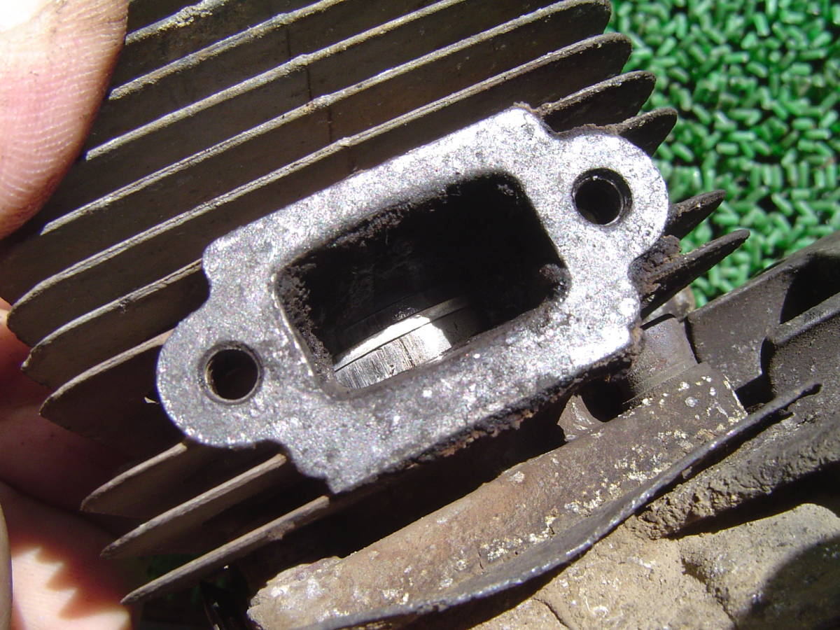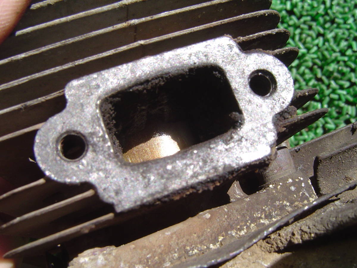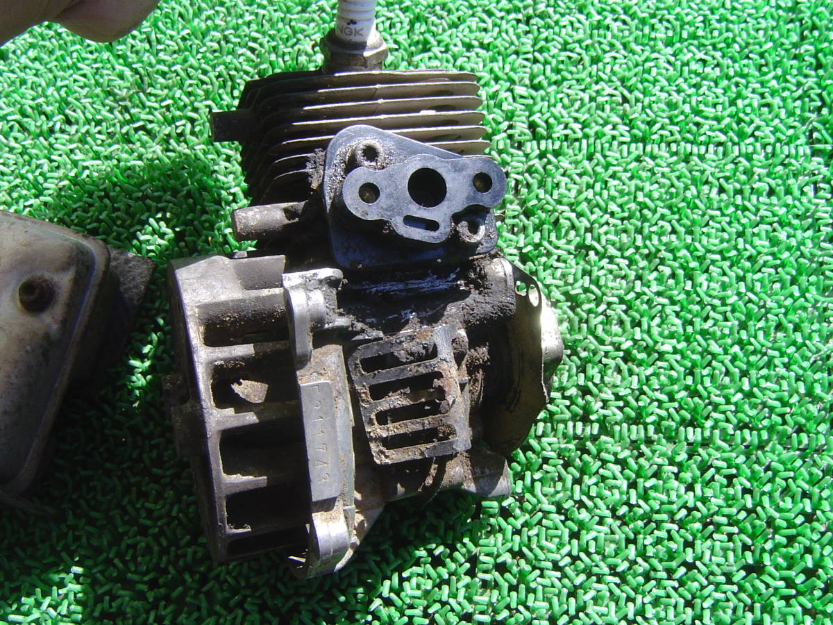 上の動画ではかかっていますが、指でフライホイールを回した感じでは圧縮低下しています。 使用頻度が高いからだと思います。 吸気口から見る限り、ピストンに目立つ傷はありませんでした。 排気口にやや傷がありますが、おそらくこれが原因で圧縮が下がっているわけではないと思います。 「あれが無い、これが無い」とは私は書きませんので写真をよく見て何がついているかご自身で判断して下さい。