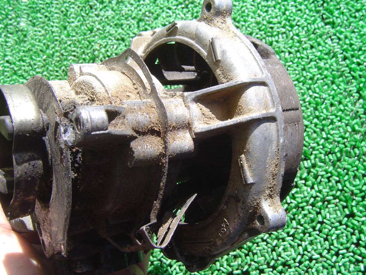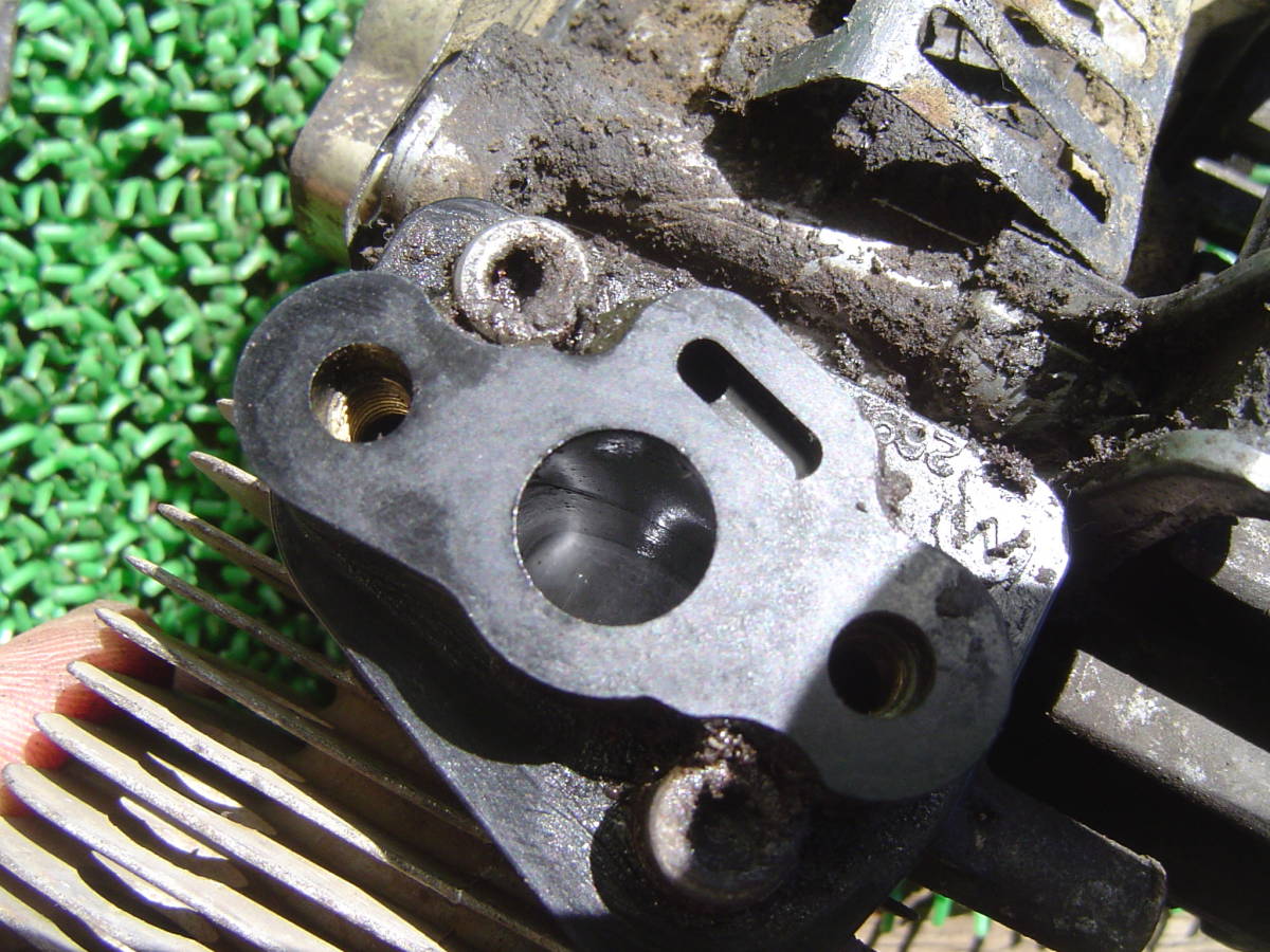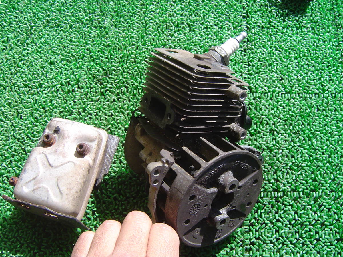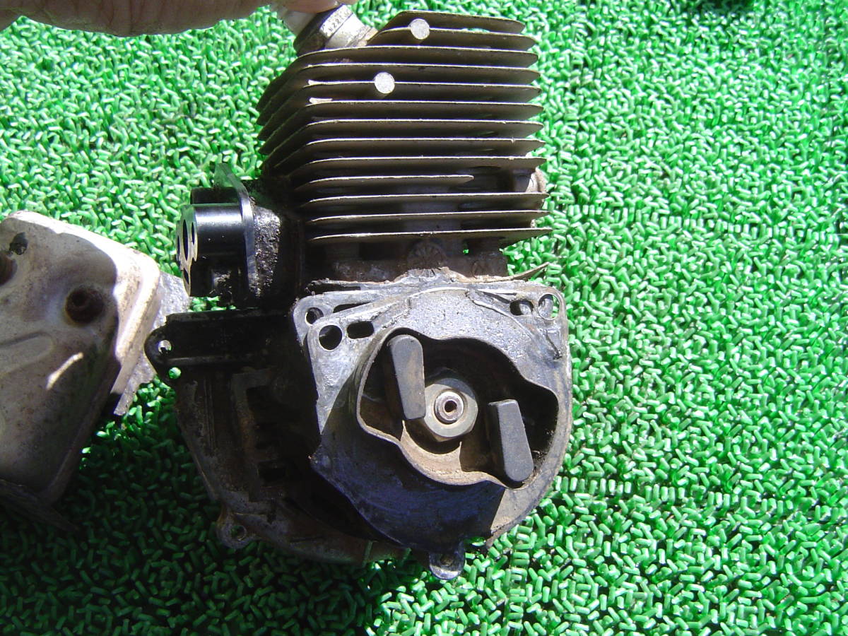 上の動画ではかかっていますが、指でフライホイールを回した感じでは圧縮低下しています。 使用頻度が高いからだと思います。 吸気口から見る限り、ピストンに目立つ傷はありませんでした。 排気口にやや傷がありますが、おそらくこれが原因で圧縮が下がっているわけではないと思います。 「あれが無い、これが無い」とは私は書きませんので写真をよく見て何がついているかご自身で判断して下さい。