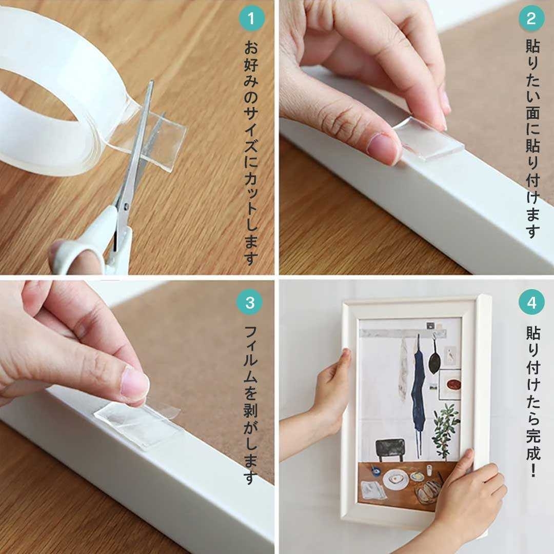 使い勝手の良い透明粘着両面テープです!魅せる便利グッズだからこそ無色透明でシンプルに。壁面デザインやインテリアを邪魔することのないシンプルさはいつまでも飽きが来ないデザインです。また、こちらは水洗いで何度も繰り返し使えることができるんです!