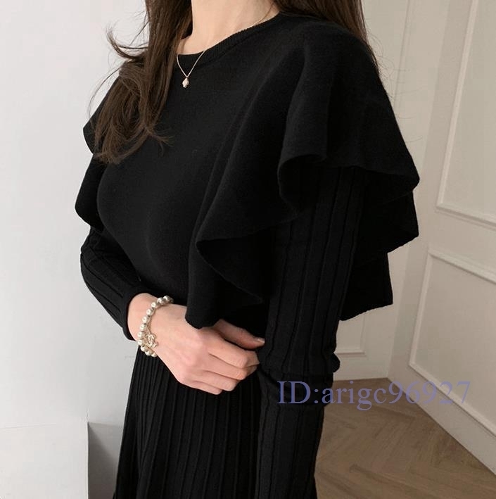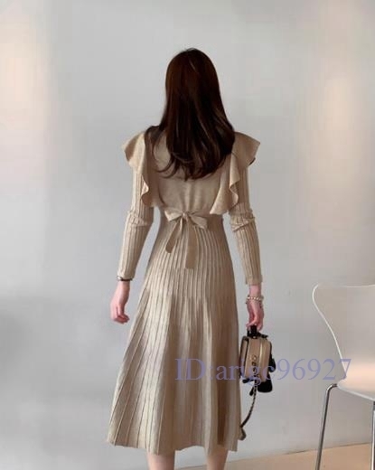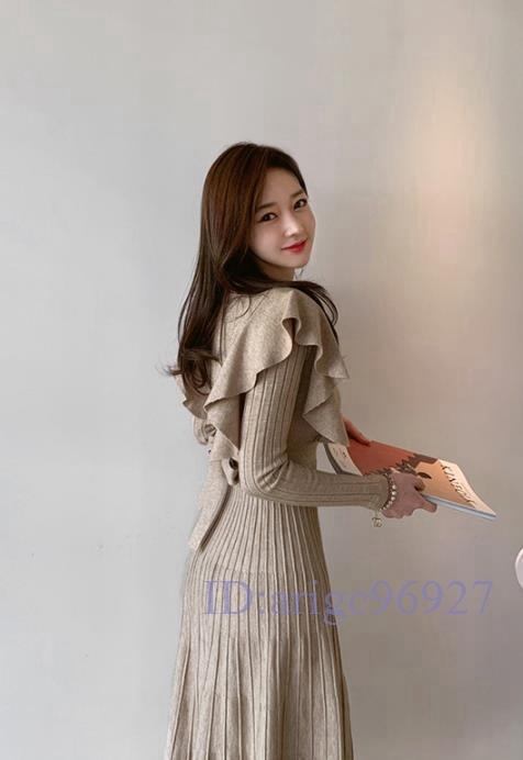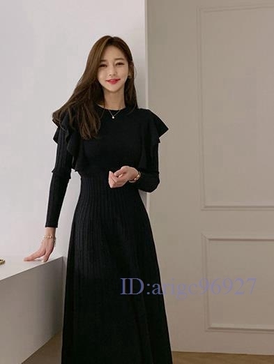 M012★ ワンピース ニット レディース ロング丈 無地 シンプル 長袖 秋冬 リボン付き Aライン 着痩せ エレガント