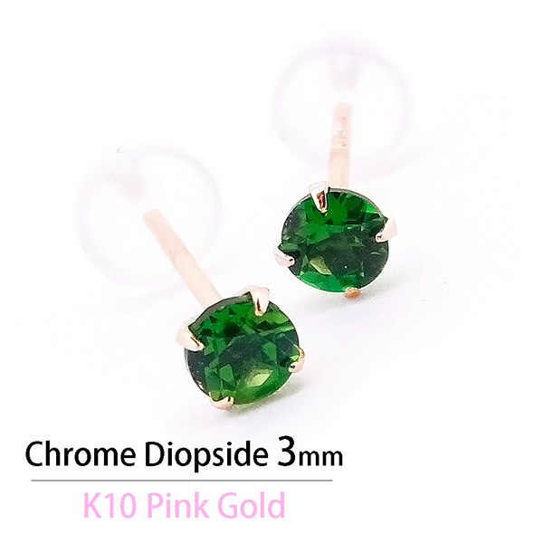 K10 ピンクゴールド K10PG 製 3mm クロムダイオプサイド 4本爪 定番 スタッド ピアス 天然石 パワーストーン ダイオプサイト 両耳用
