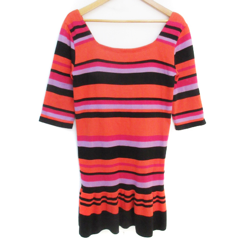 スマッキーグラム ニットワンピース フレアワンピース ミニ丈 五分袖 スクエアネック マルチボーダー柄 4 黒 オレンジ ブラック レディース