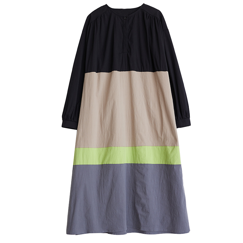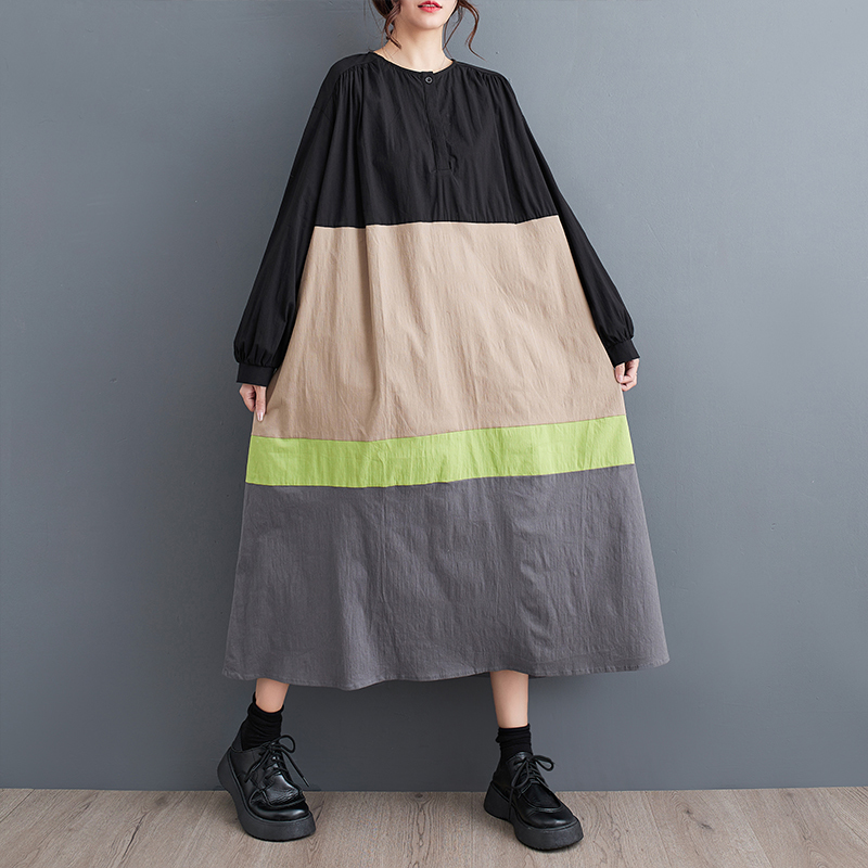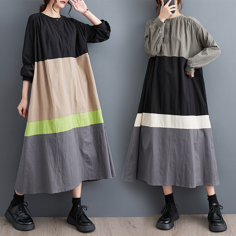 「同梱1万円送料無料」 秋新作*レディース*カジュアル*ゆったり大きいサイズ*体型カバー*配色*切り替え*長袖ロング丈ワンピース*F*灰