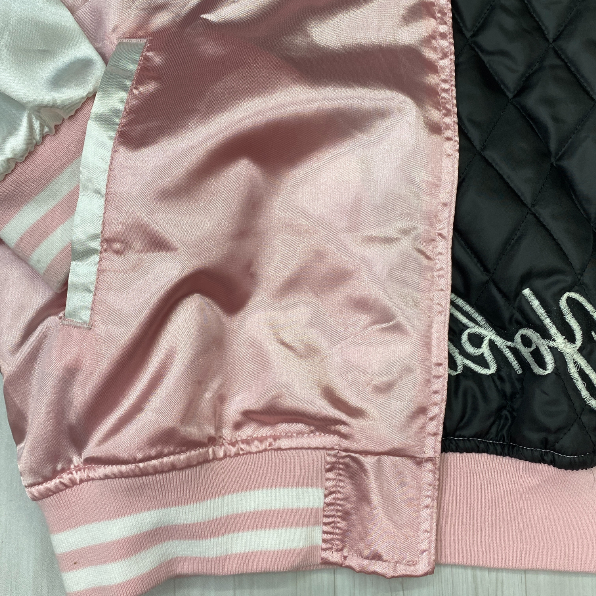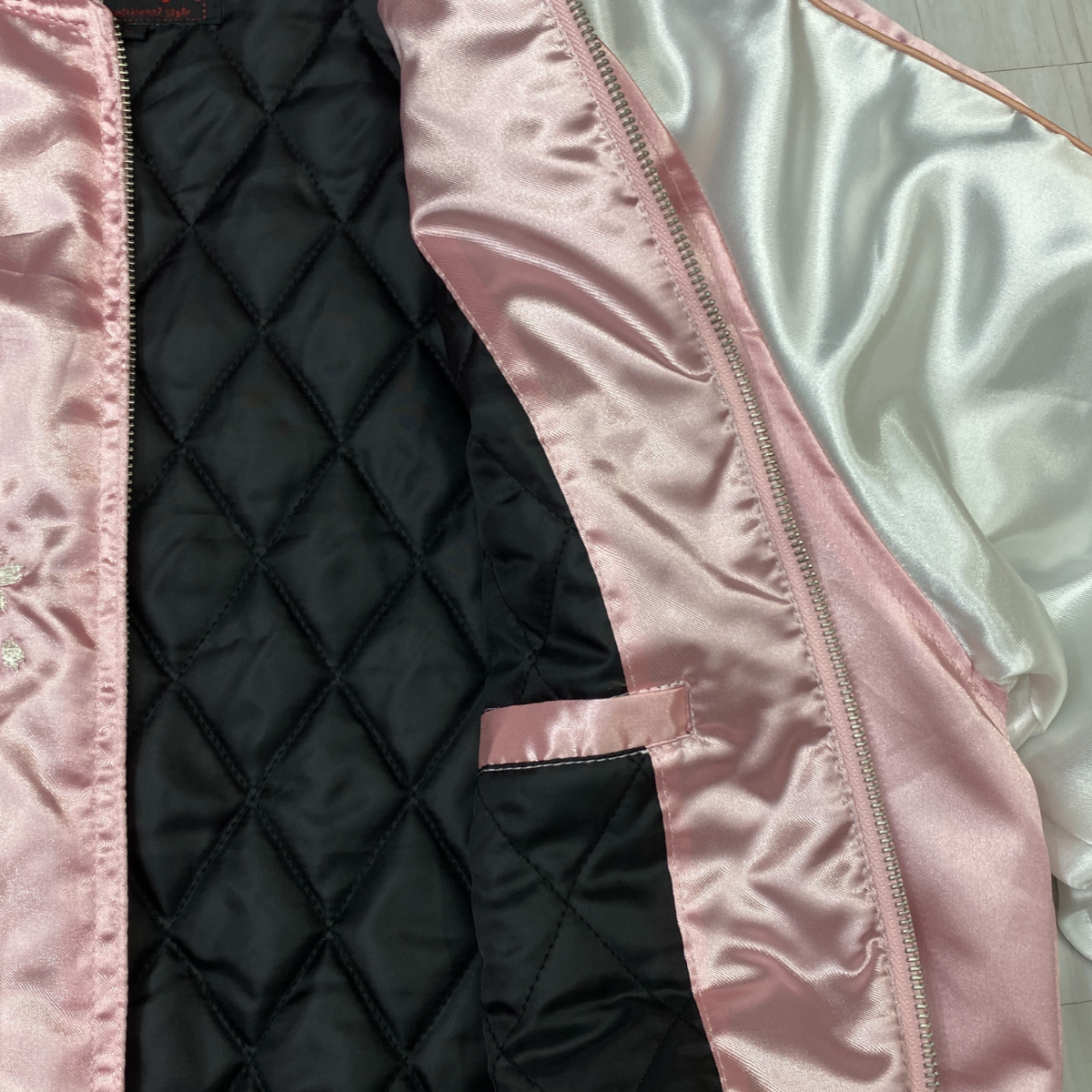 ・中綿入りのサテン地にオリエンタルなムードの刺繍が施されたヌケ感漂うデザインが持ち味
