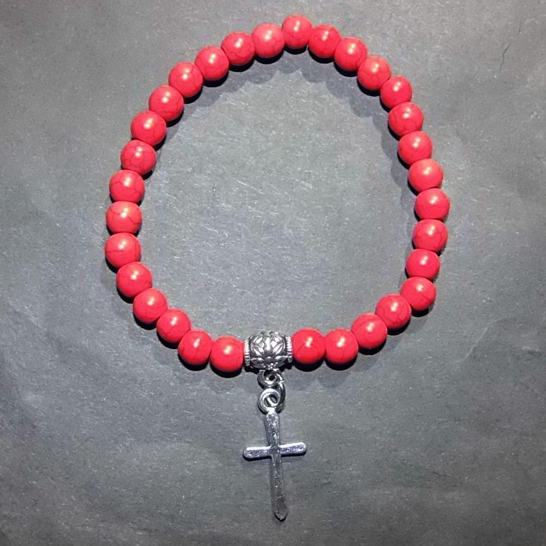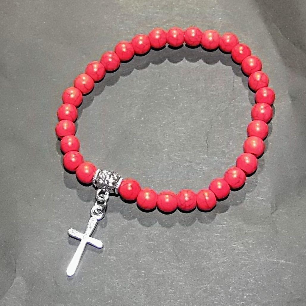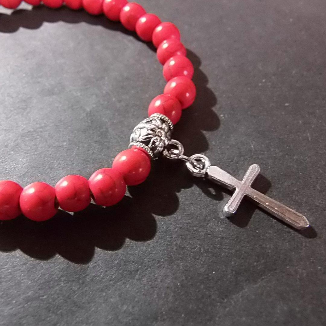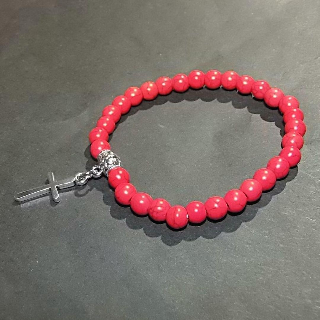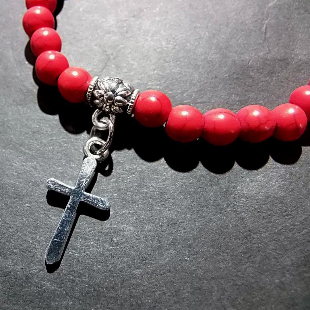 十字架 クロスモチーフ 天然石 赤色 レッド ビーズ ブレスレット 数珠