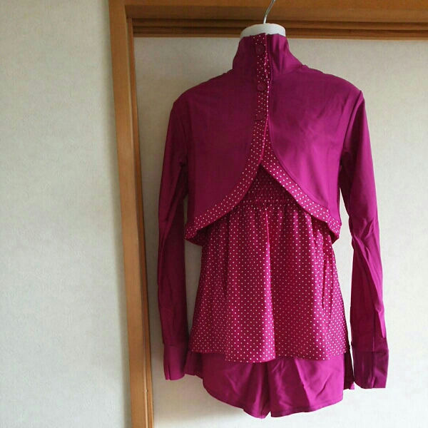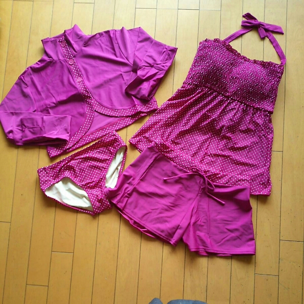 トリンプ豪華4点付きです。おしゃれなラッシュガードのような物がついています。首までガードできます。もちろん脱いでも可愛いです。サイズは9号になります。ドット柄の水着もとても可愛いです。