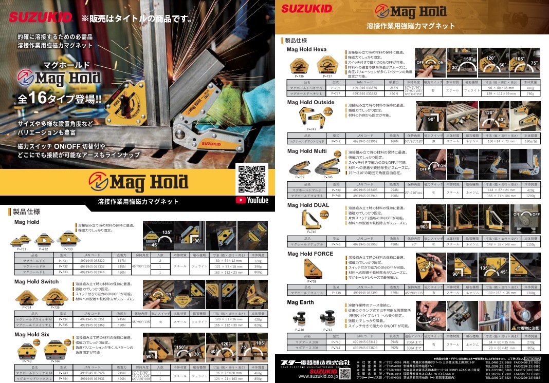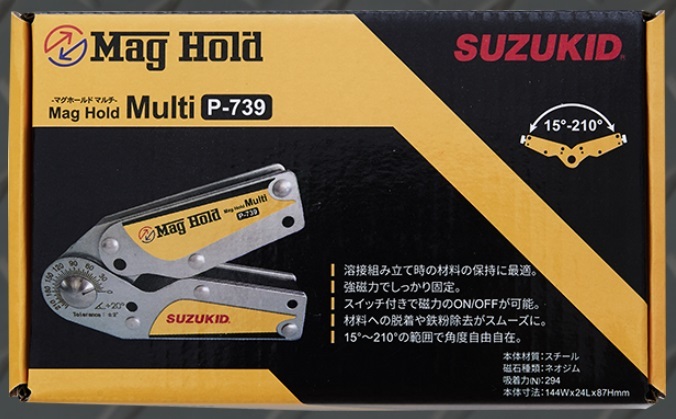 スター電器 SUZUKID溶接作業用 強磁力マグネット 磁力ON/OFFスイッチ式マグホールドマルチP-739設置角度15°~210°と広範囲に対応。磁力ON/OFFのスイッチ付で設置・取り外し時のズレも解消!■特徴1.溶接作業時の位置決めや、角度保持の際に両手がフリーに!2.15°~210°のお好きな角度での保持が可能で幅広い作業に最適!3.スイッチ付でワークへの取付・取外しが手軽!使っていない時に鉄粉が付着する心配もないのでストレスフリー!4.吸着力は294(N)。■仕様型式:P-739本体寸法:幅144 × 奥行87 × 高さ24mm質量:420g保持角度:15°~210°(自在)吸着力:294N磁石の種類:ネオジム磁力スイッチ:○
