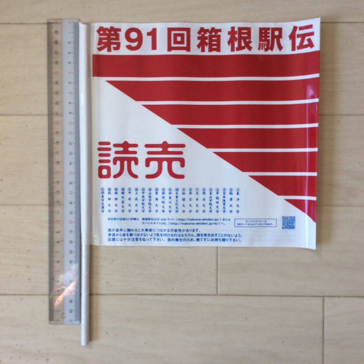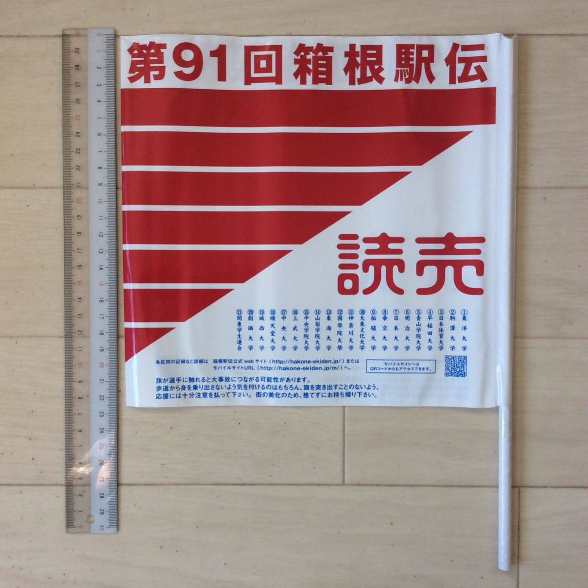 第91回(平成27年)箱根駅伝 読売新聞応援旗 1本 タテ約22.5センチヨコ約24センチ(旗部分)旗部分の材質はビニール。棒部分の材質は紙。出場校名が印刷されています。(大会当日に神奈川県の藤沢橋交差点付近で配布されたものですので、ある程度の皺や保管時の巻き癖があります。)