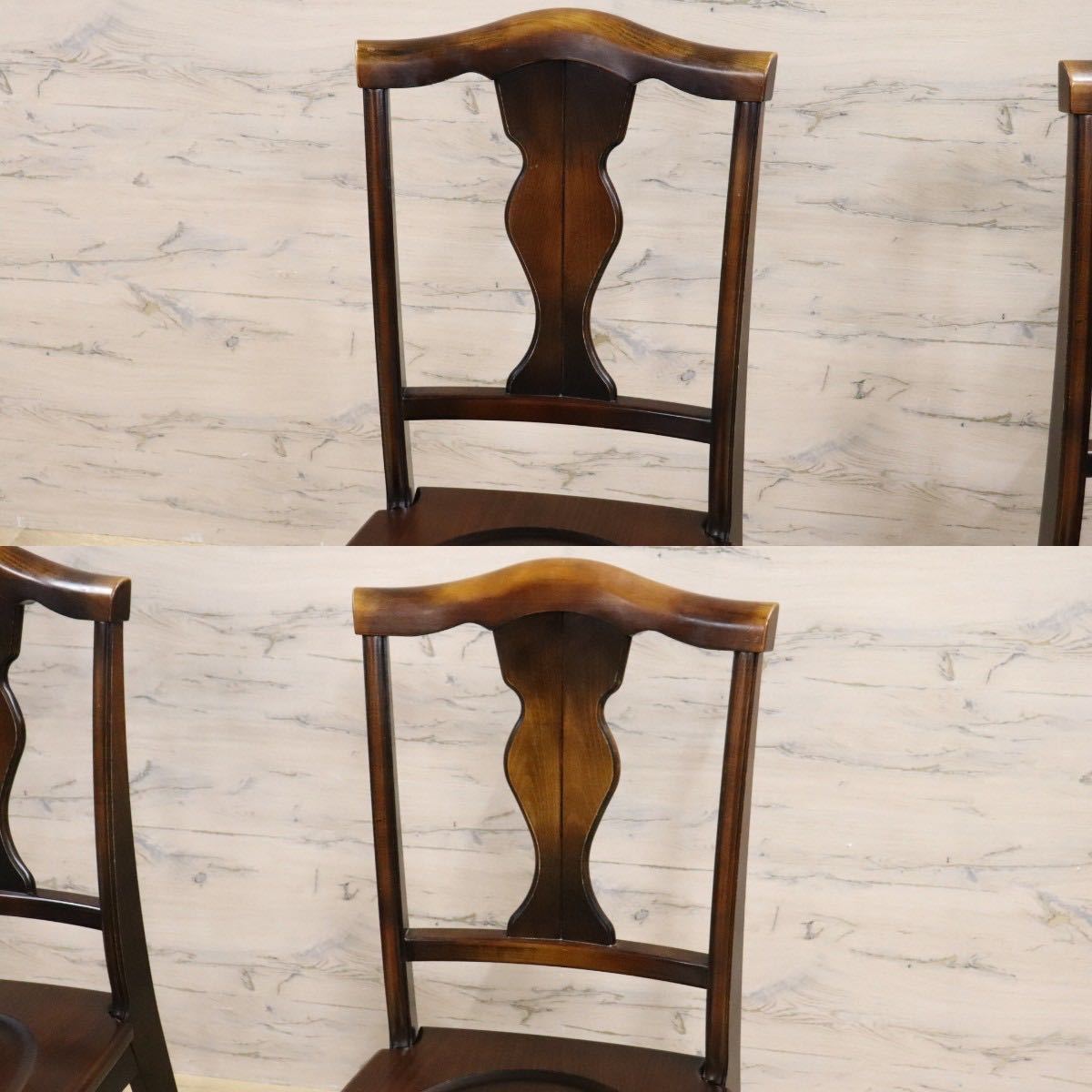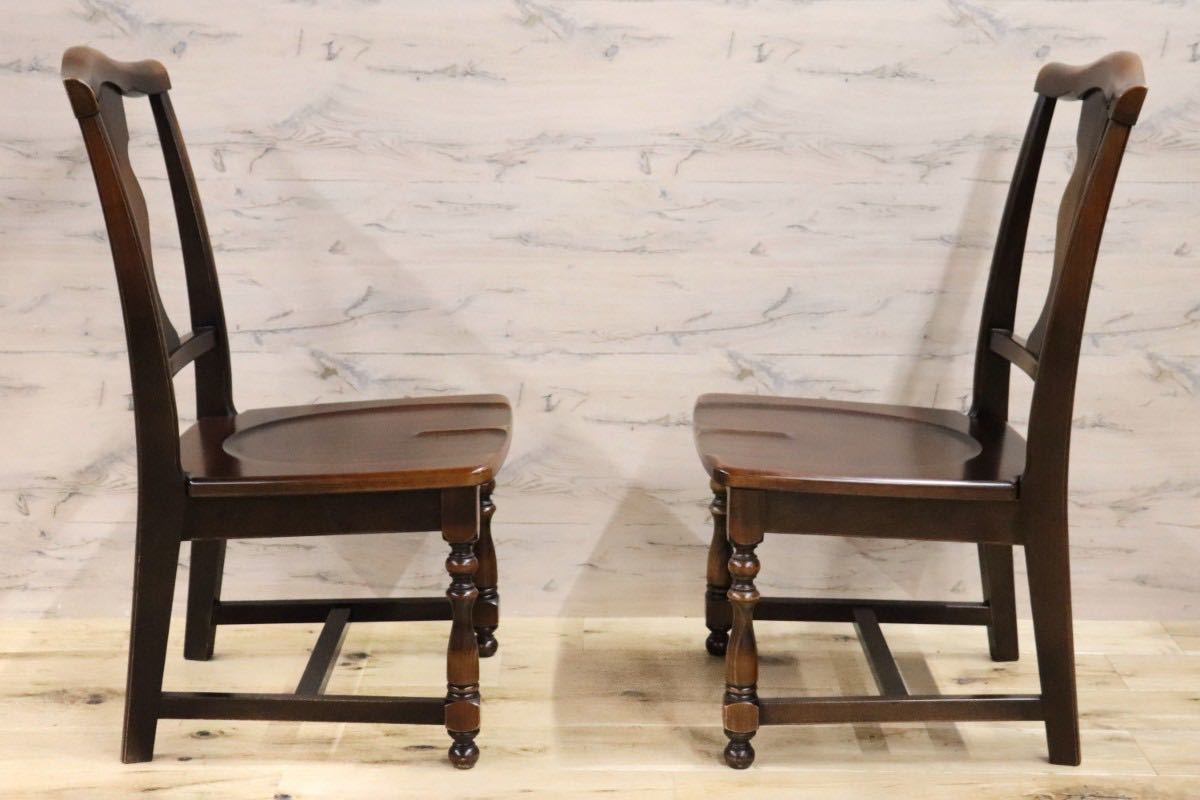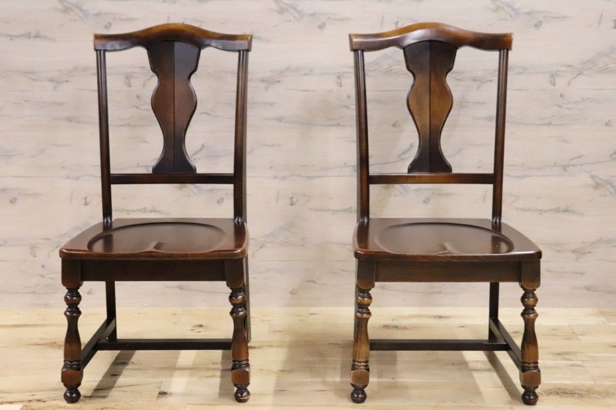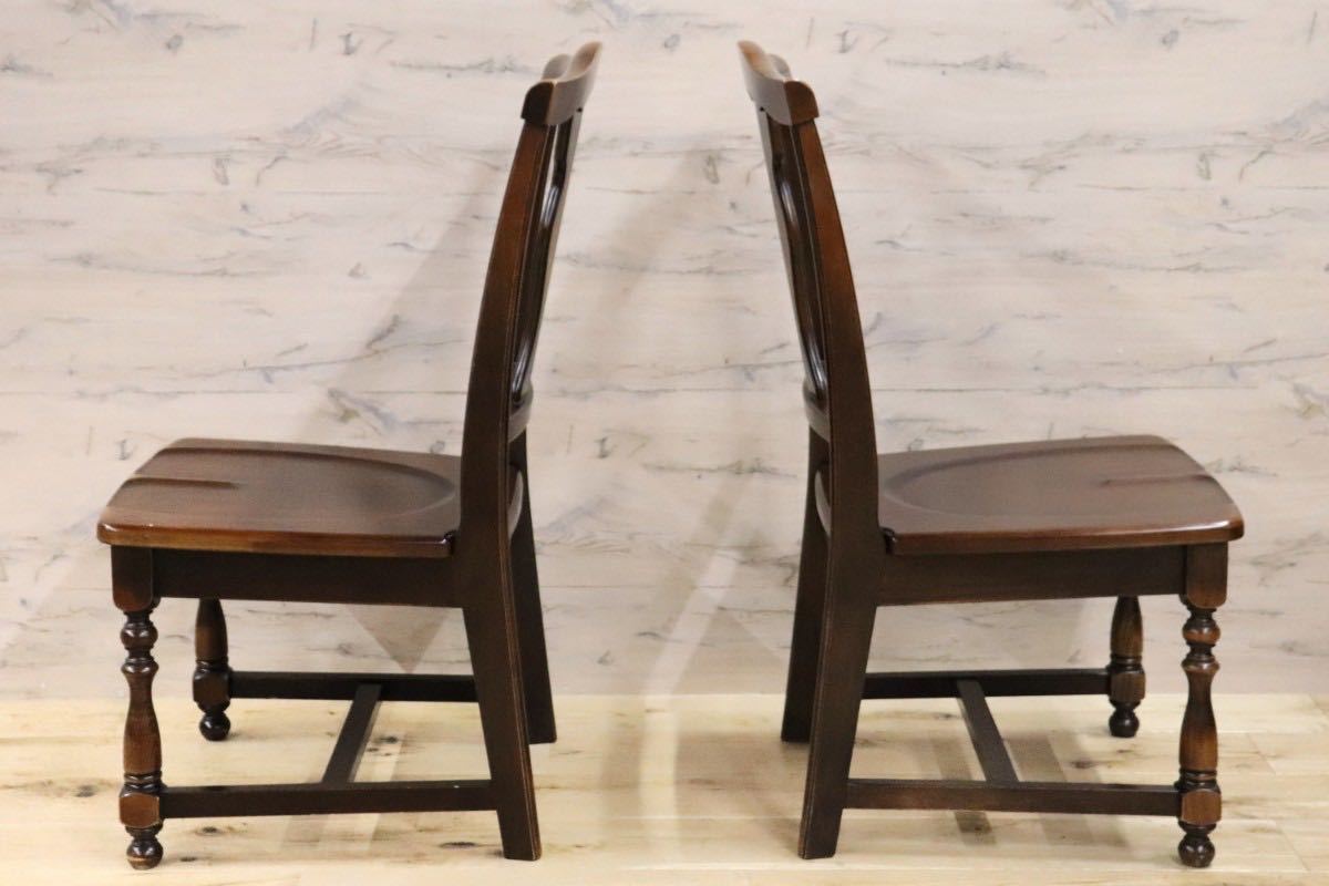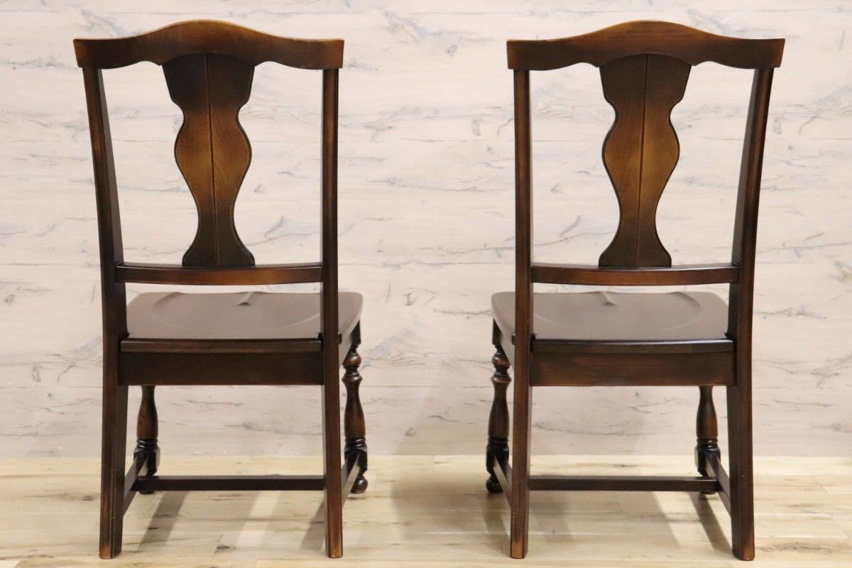 静岡家具によるクラシックな雰囲気漂うダイニングチェア。深い色合いとさり気なく施された装飾が高級感を出し、しっかりとした造りで安心感もあります。