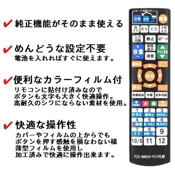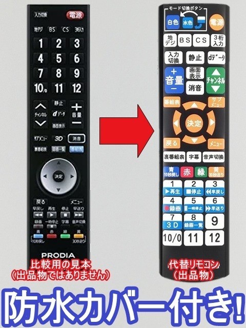 | 【商品名】 PRODIA PIX-RM034-PZ1代替リモコン 【対応機種】 PRD-LH132B PRD-LH132BA 【商品について】 右側の代替リモコンが出品物になります。左側のリモコンは見本画像です。 タイトル機種のリモコン信号を入力した、設定不要で使える純正品と同等の代替リモコンです。 リモコン左上のモード切換ボタンにて、各機能全てのボタンをお使いいただけます。 商品に不具合があった場合は代替品交換かご返金にて対応させて頂きます。 【付属品について】 防水リモコンカバーをお付けします。 ボタン機能を印刷した薄型フィルムはリモコンに貼付け済みです。 乾電池は付属しません。別途ご用意下さい。(単4乾電池×2本) 【発送について】送料無料 迅速発送を心掛けております。土日祝日はお時間を頂く場合ございます。 ポスト投函配達となり、日時指定は出来ません。 | ||