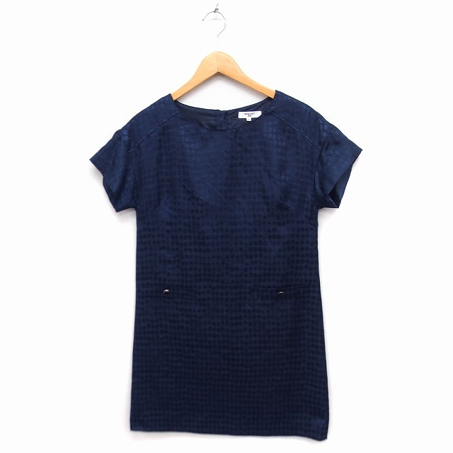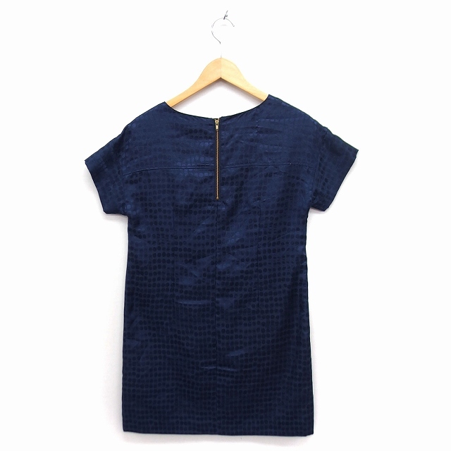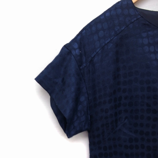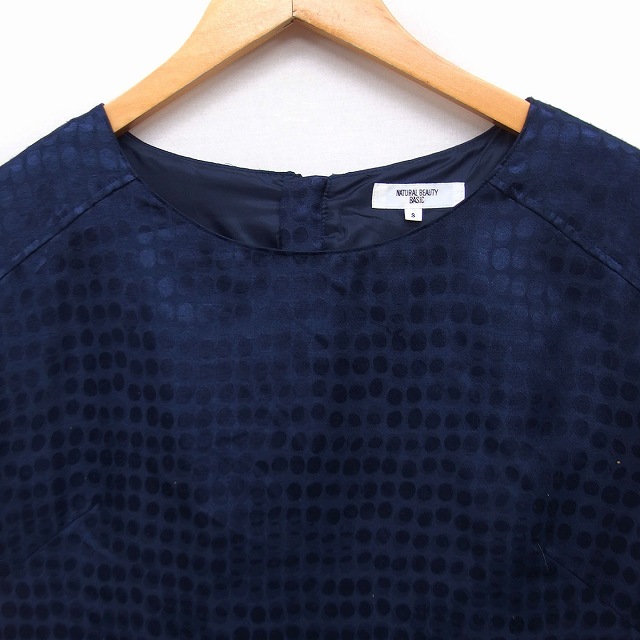 ナチュラルビューティーベーシック NATURAL BEAUTY BASIC ドット柄 ワンピース ひざ丈 半袖 丸首 光沢 S ネイビー 紺 /FT3 レディース
