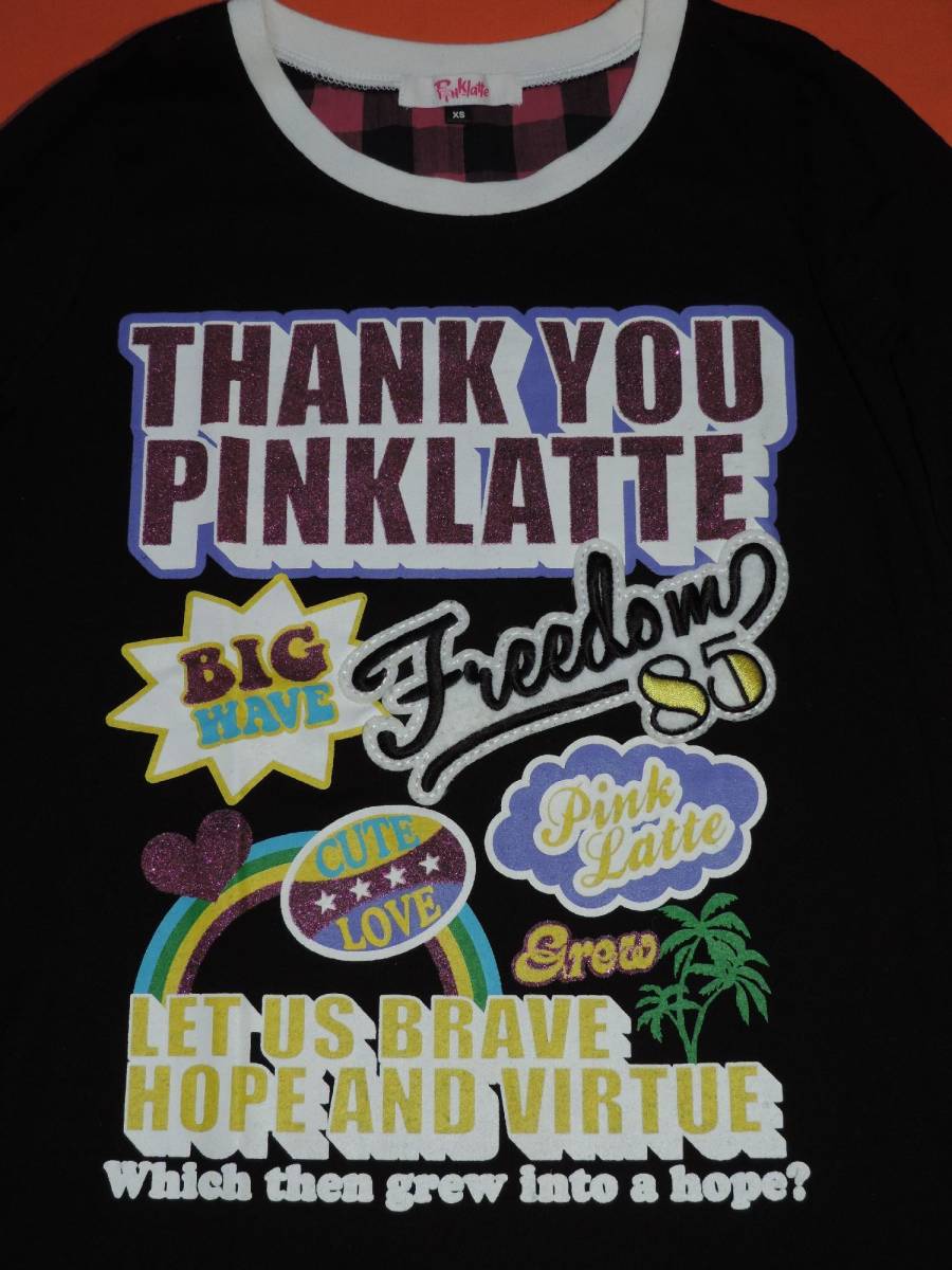 ☆ピンクラテのラメロゴと英文字前後プリント裾チェック黒長袖Tシャツ☆XSサイズ☆