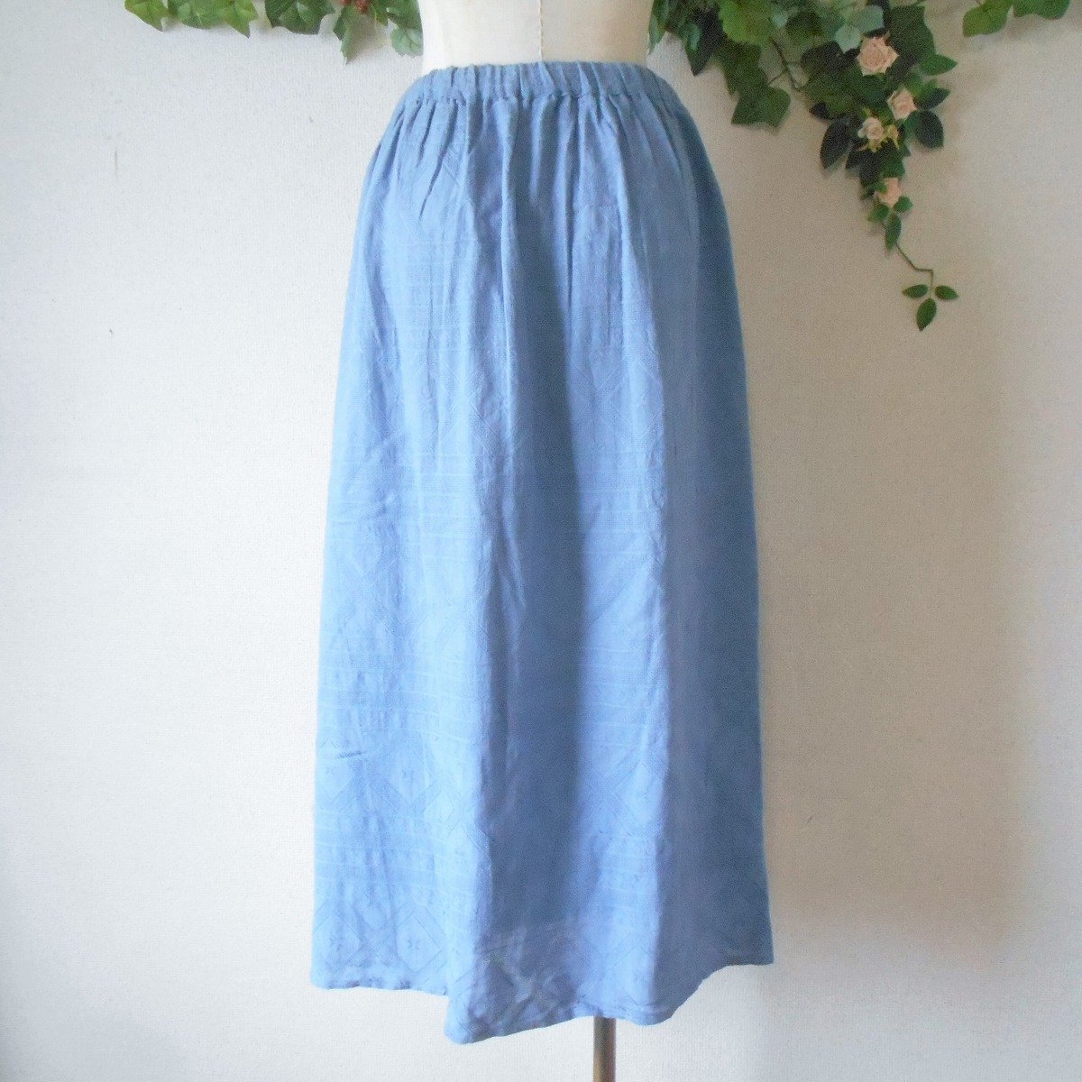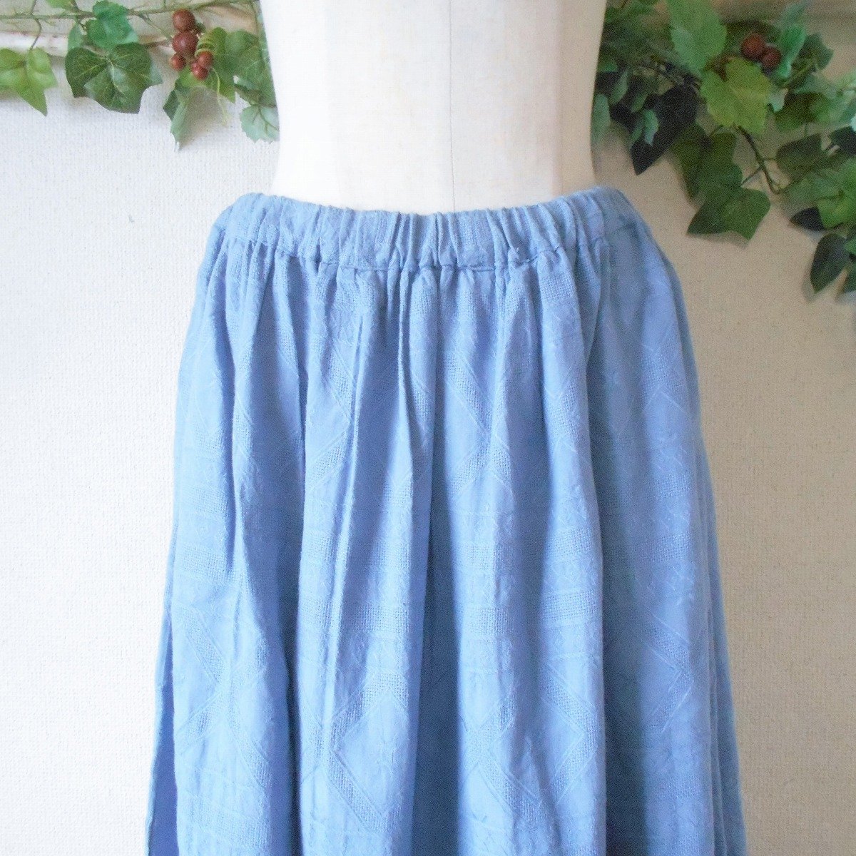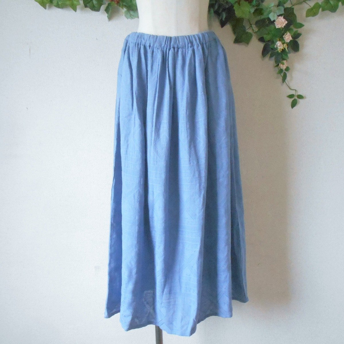 【ポイント】クラウドナインのスカートになります。お色は水色系で春夏を中心に着ていただけるお品です。織柄入りの生地で爽やかな印象の一着です。