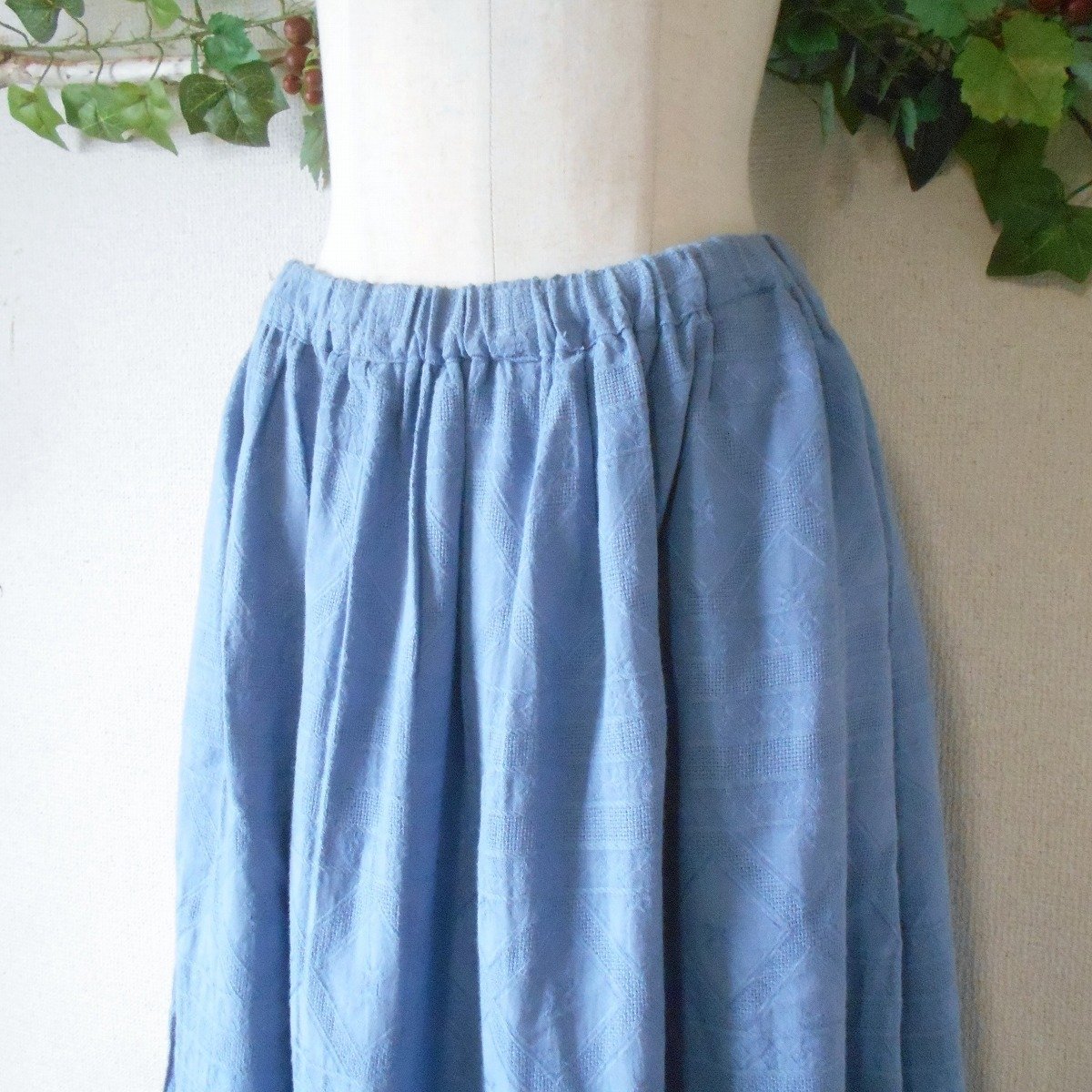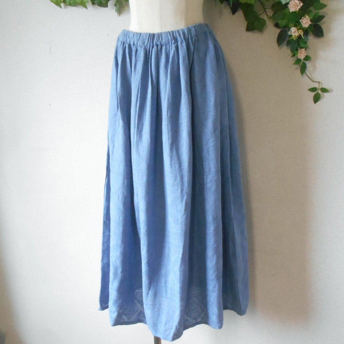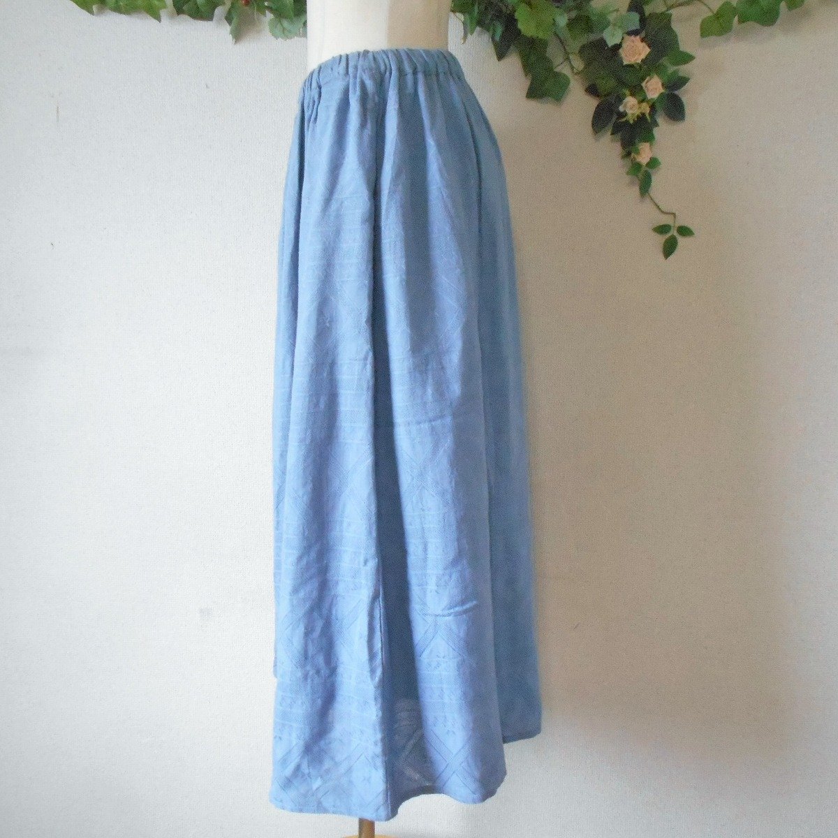 【ポイント】クラウドナインのスカートになります。お色は水色系で春夏を中心に着ていただけるお品です。織柄入りの生地で爽やかな印象の一着です。