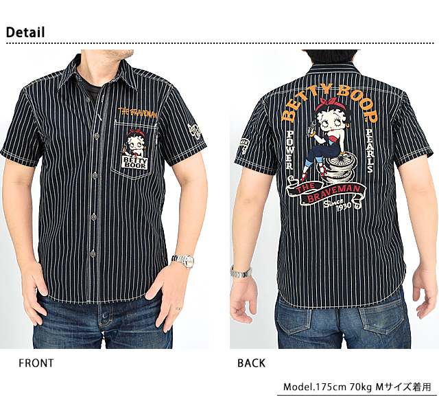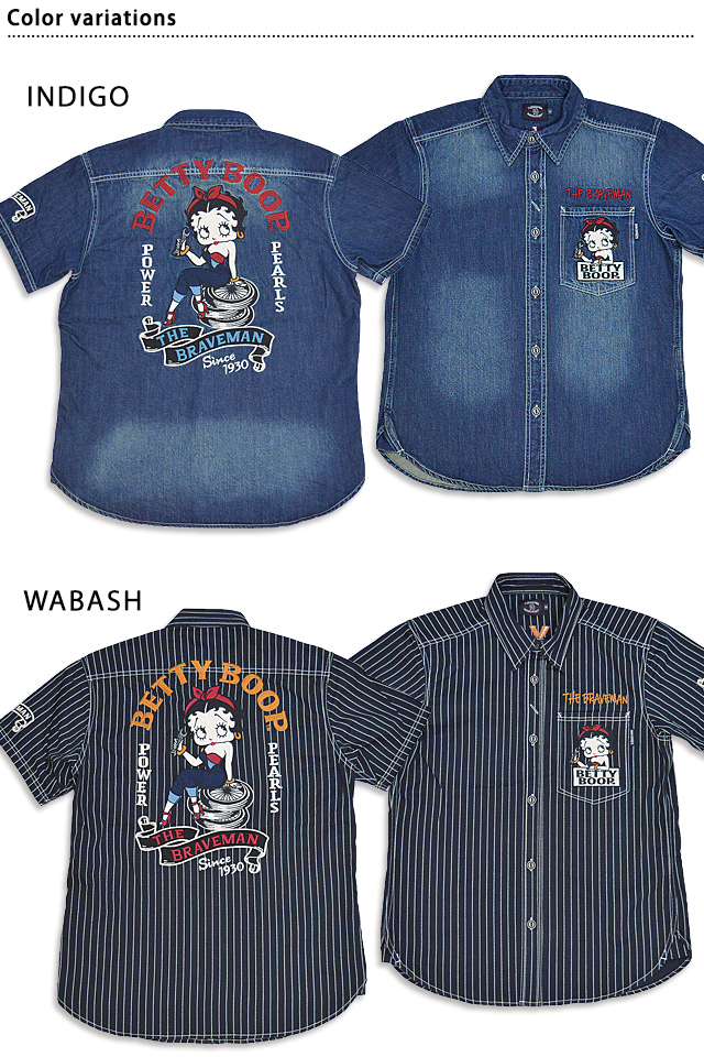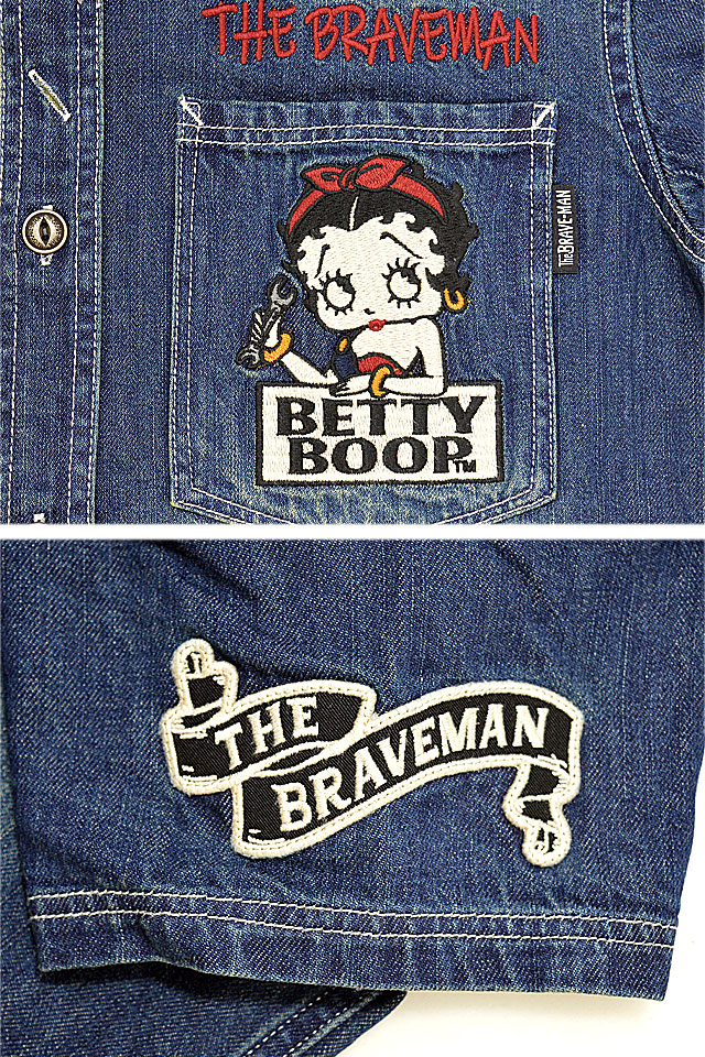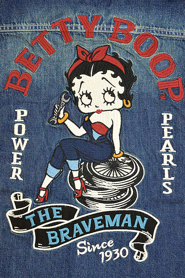 1920年代~40年代にアメリカでワークウェアを中心とした製品を世に送り出したブランド「The BRAVE-MAN」から「BR×BETTYコラボ デニム半袖シャツ(BBB-2325)」のご紹介です。 大きな瞳とぽってりした赤い唇が印象的な女の子、ベティ・ブープ(Betty Boop)。 タイヤに腰掛けたセクシーなベティを、背中に刺繍で落とし込みました。 ボディーには、しっかりとしたデニム生地を採用。 カジュアルに着こなしに取り入れることの出来る、大人のキャラクターアイテムです。 | |||||||||||||||||||||||||