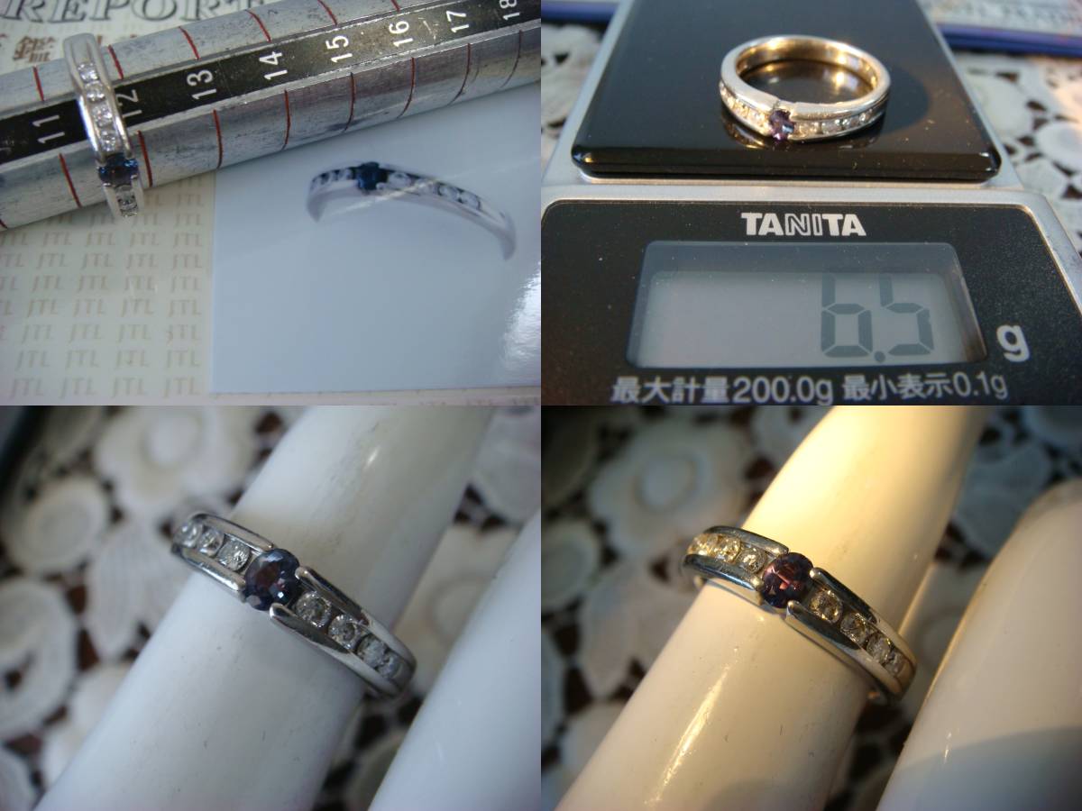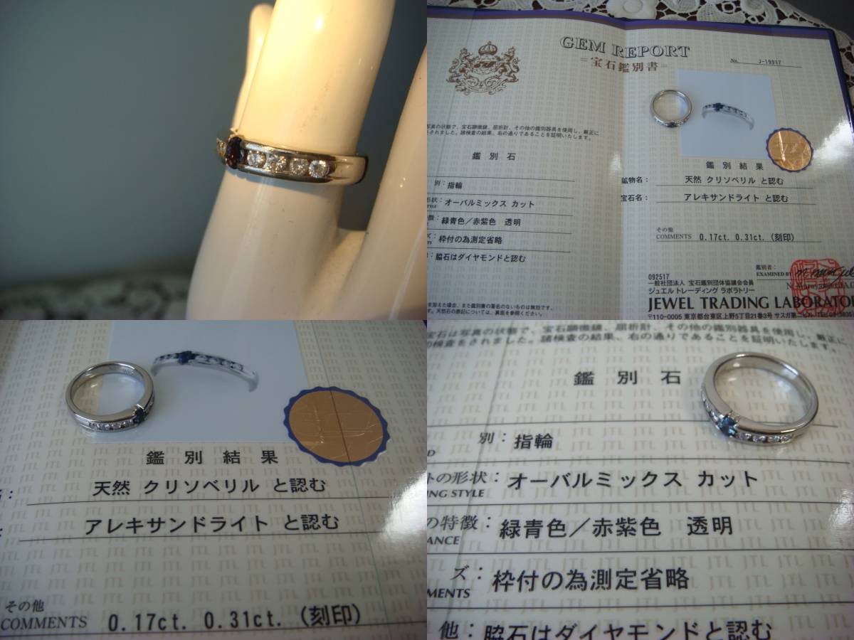 アレキサンドライトは0,17カラット。ダイヤは0,31カラットです。鑑別書付き。